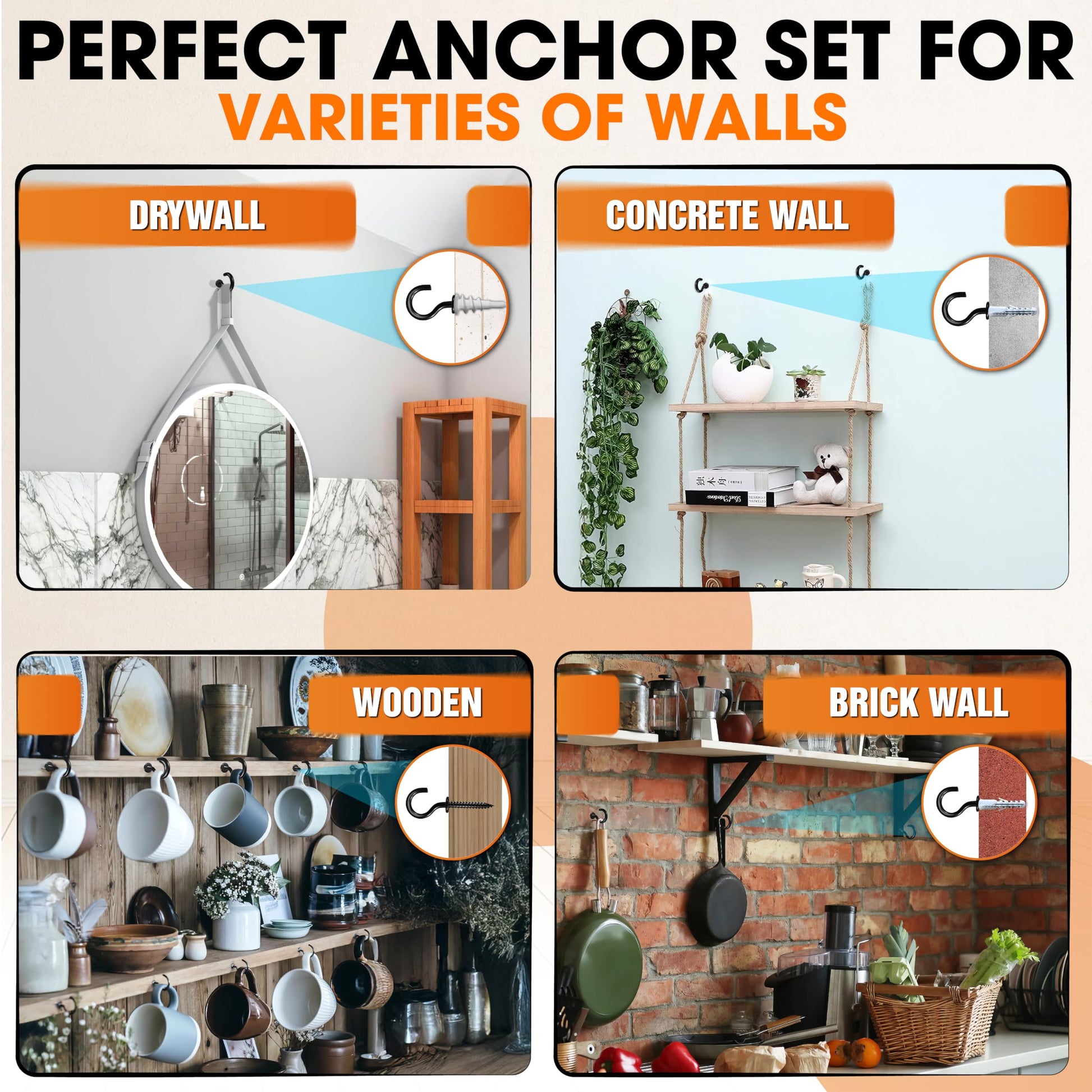 - [Compatibility on Various Wall Types] We provide self-drilling drywall anchors and accompanying plastic expansion tubes, allowing you to securely mount on drywall, wood, brick, or concrete surfaces. Perfect for hanging pictures, shelves, stringing lights, kitchen utensils, curtain rods, and decor, these anchors offer a secure hold without requiring extensive tools.