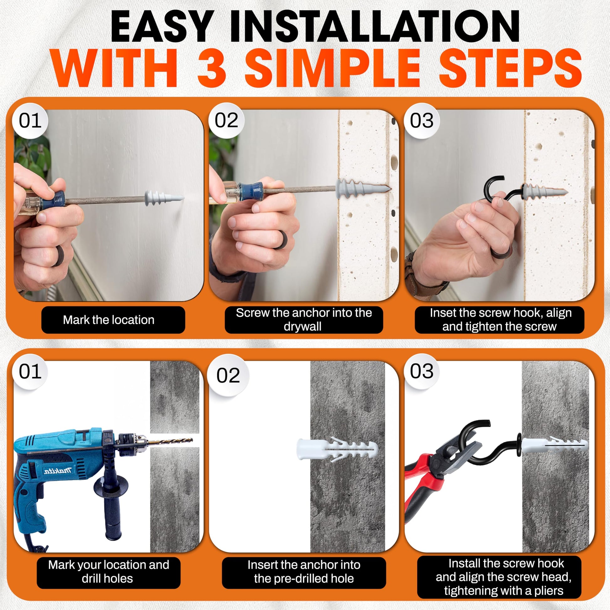 - [Simple and Easy Installation] Installation is quick and requires minimal tools, just a hand tool or drill, then tighten the hook. The included plastic expansion tubes provide extra support on hollow or harder walls, making it easy for anyone to install a sturdy, reliable hanging solution without the need for specialized skills or equipment.
