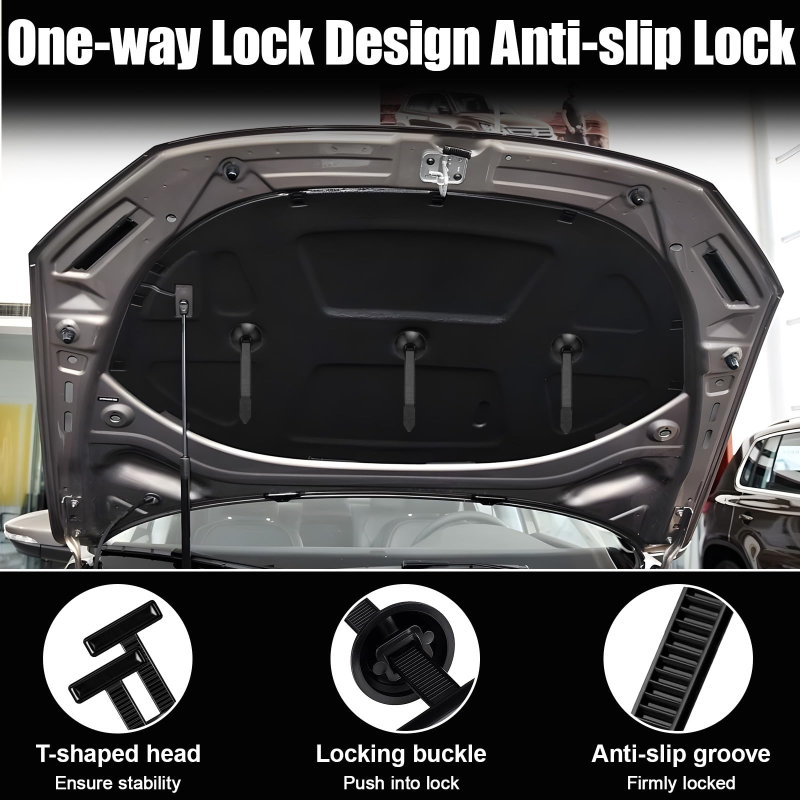 - Quick Installation, One-Touch Self-Locking Function:In an emergency, you need to quickly complete the bundling and securing operation, but traditional bumper retainer clips are cumbersome to install. Our cable ties feature a one-touch self-locking function that requires no tools. Simply thread the slot strap through the hole, insert the buckle strap, and push it to the bottom to complete the securing process. The operation is simple and quick, allowing you to easily complete the installation anytime, anywhere, thereby enhancing usability.