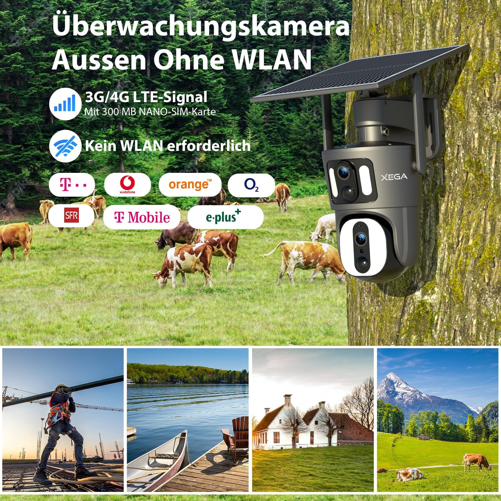 Xega 4G LTE Security Camera【Dual Lens】 No Wi-Fi Solar Cellular Security Camera Wireless Outdoor Built-in SIM Card 1080P 360° View PIR Detection Color Night Vision Two-Way Audio IP66 Waterproof