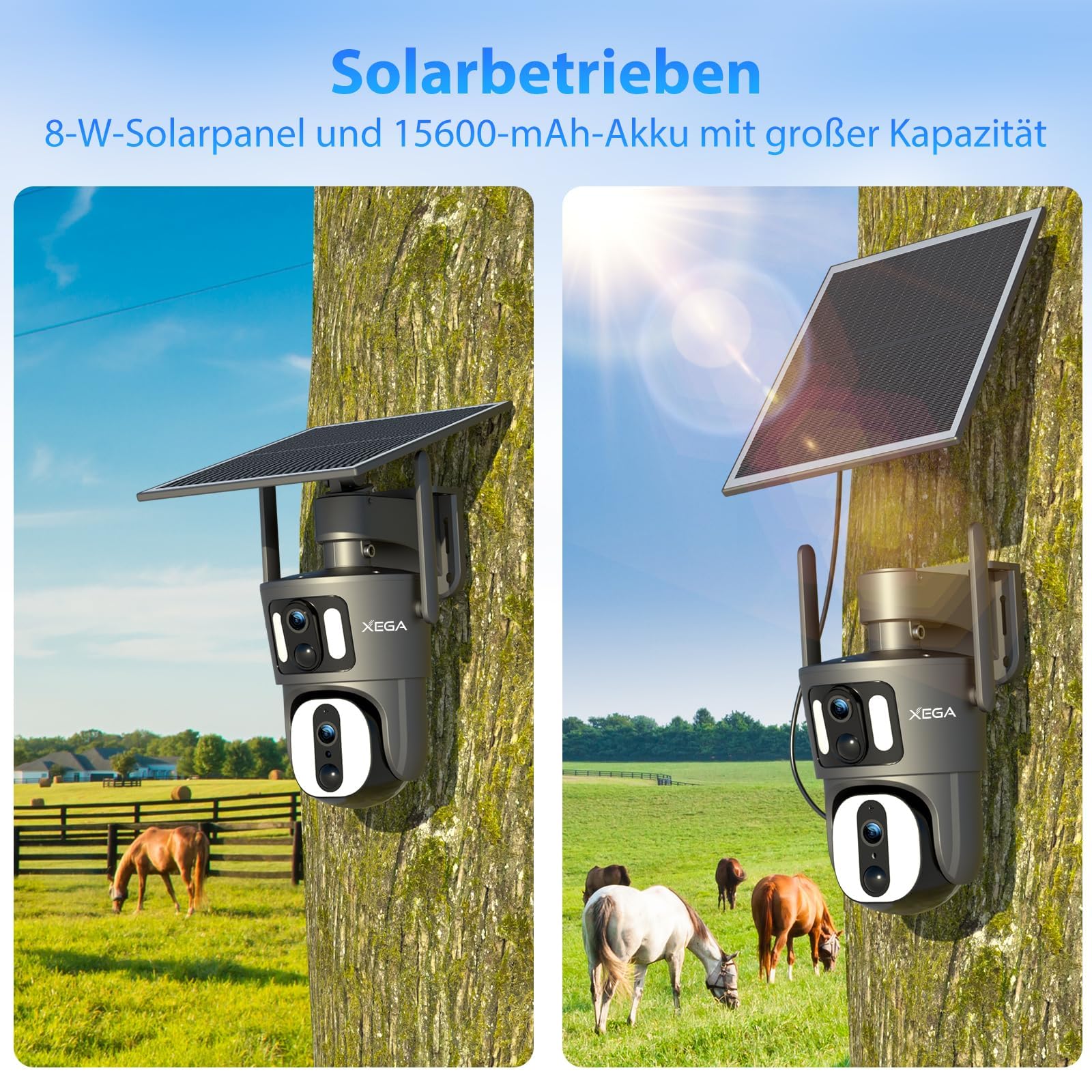 - 【Composed of Dual Lens】The dual lens camera achieves different focal length coverage by using a 6mm telephoto lens and a 2.8mm wide-angle lens. This innovation breaks the limitations of single-lens cameras, you can capture a broader and more detailed perspective on everything with Xega security camera at one time.With 355° Pan & 100° Tilt surveillance, We can eliminate blind spots and ensure our front porches, backyards, driveways and other areas are covered.