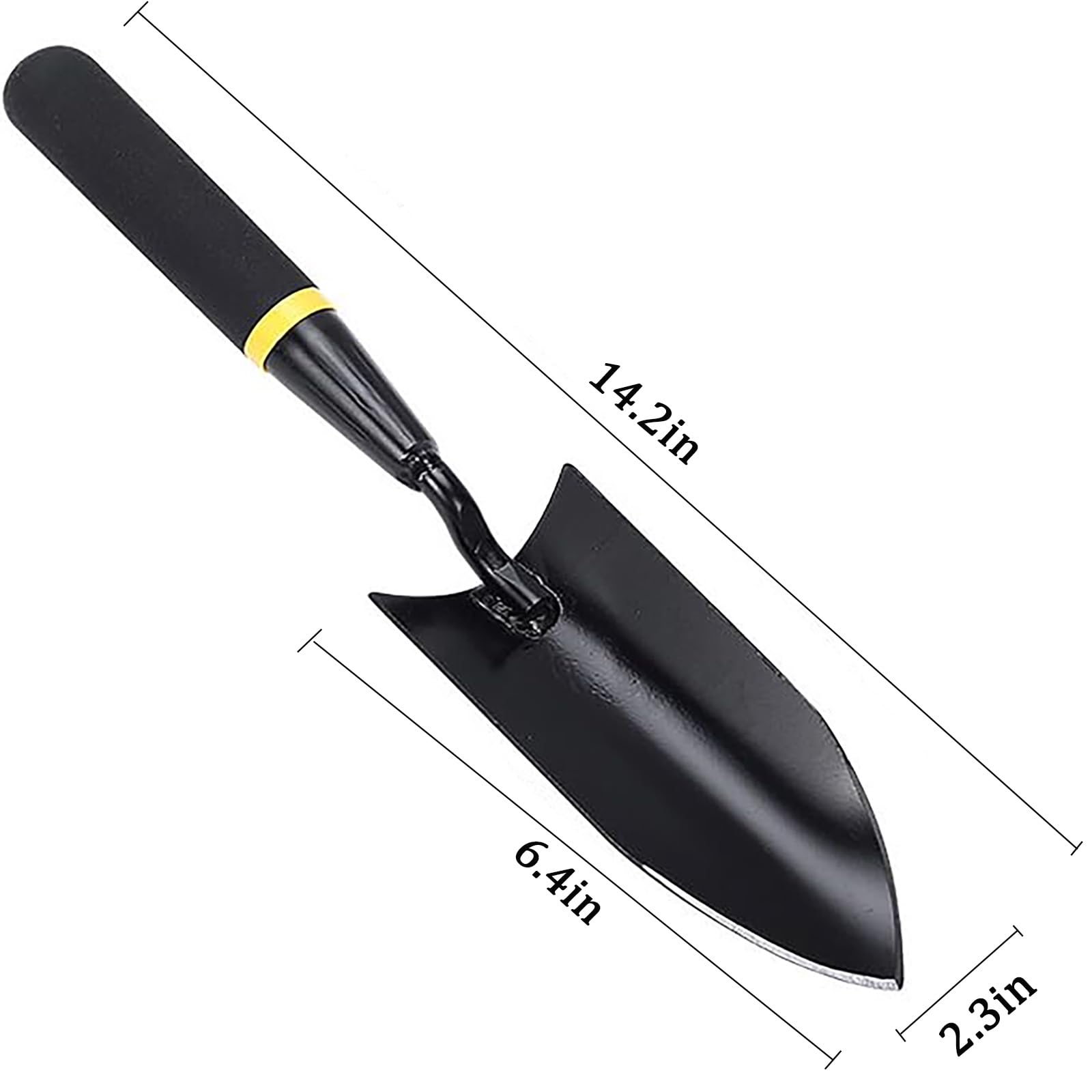 Details: Get your gardening work done with confidence with this heavy duty hand trowel. Featuring a sturdy carbon steel construction with a smooth black finish and silver-edged blade, this professional-grade tool is up to the task of tough digging. The ergonomic rubberized handle with distinctive yellow accents prevents hand fatigue during prolonged use, providing superior comfort and control. Ideal for precision planting, transplanting, weeding and cultivating work in the garden beds. The durable design also makes it a great companion for beach activities. The sharp blade cuts through soil and fine roots with ease, while the wide shovel moves material efficiently. Balanced weight distribution and sturdy construction ensure that this small shovel will be your go-to tool for seasons to come. The set includes a small wide shovel and a small narrow shovel, providing you with two different digging results. Sturdy build quality and versatility make this manual trowel set an essential tool in a gardener's toolkit.