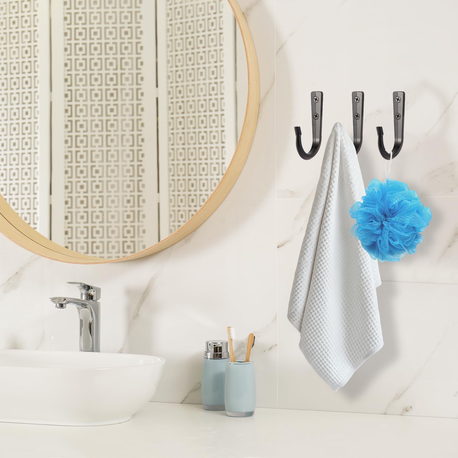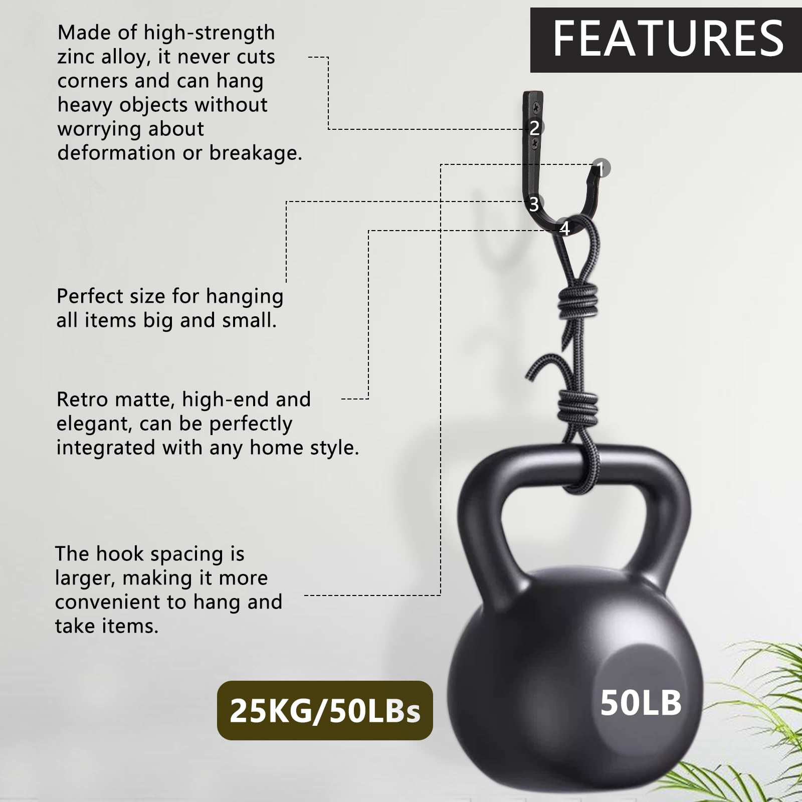 - Strong load-bearing capacity: Our heavy duty hooks are made of high-strength zinc alloy, which is 5-7 times heavier than small-sized coat hooks. They can easily bear a weight of 50 pounds, and you don't need to worry about deformation or breakage.