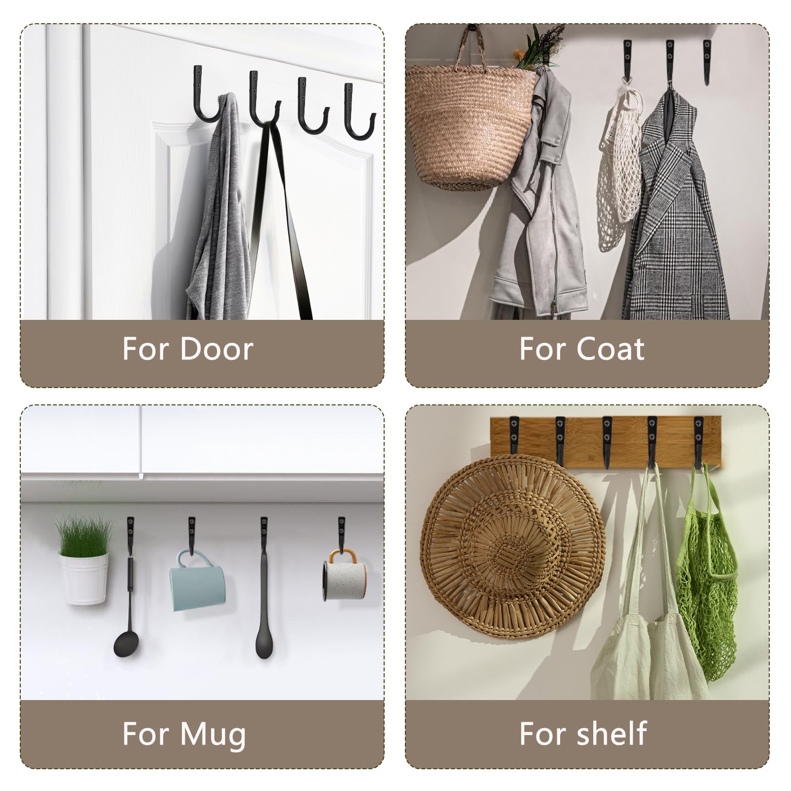 - More Wide Use: The black wall hooks can be installed on brick walls, gypsum boards, tile walls, wooden walls or behind doors, and its strong load-bearing capacity makes it more widely used, such as hanging cookware, backpacks, coats, potted plants, umbrellas, handbags, hats, leashes, scarves, towels, coffee cups and more.