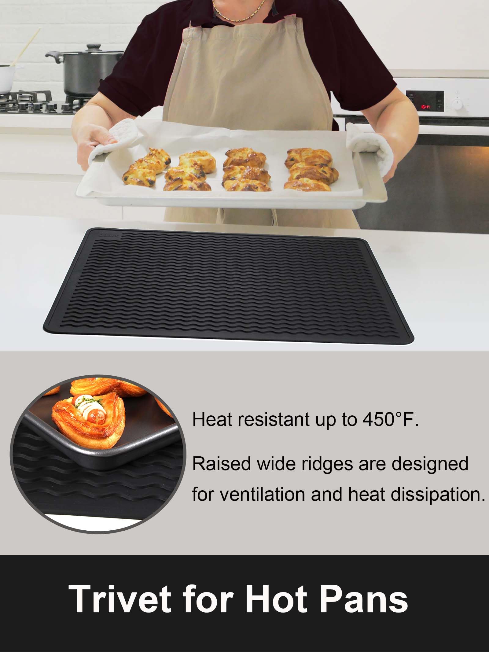 - [Silicone Trivet Mat] Elevated wave patterns ensure efficient heat dissipation, while our silicone mat withstands temperatures up to 450°F, safeguarding your surfaces from heat damage. Caution: Do not cover induction cookers exceeding 450°F or place over active cookers.