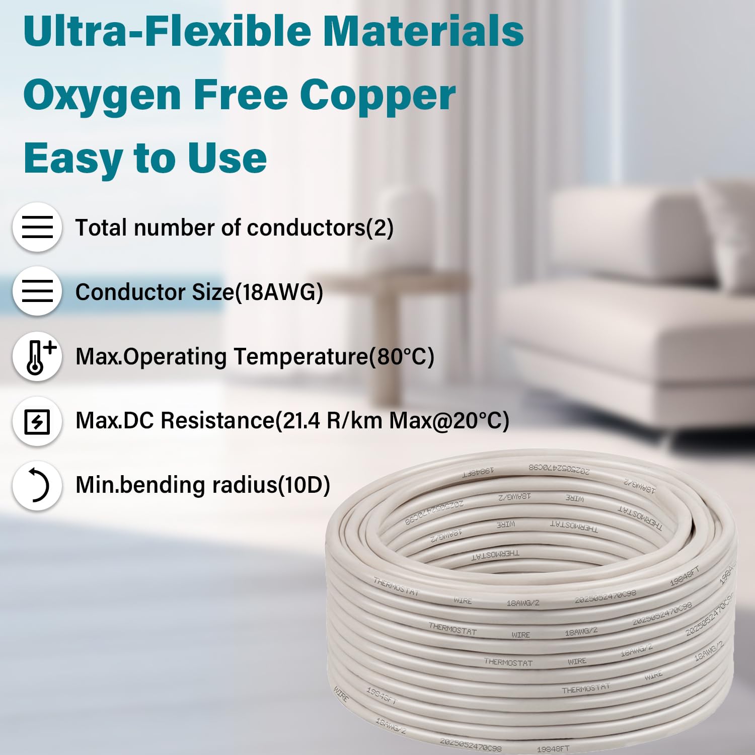 - High-Quality Thermostat Wire – 18AWG 2 conductor solid copper wire with durable white PVC jacket, ideal for thermostat and HVAC system wiring.