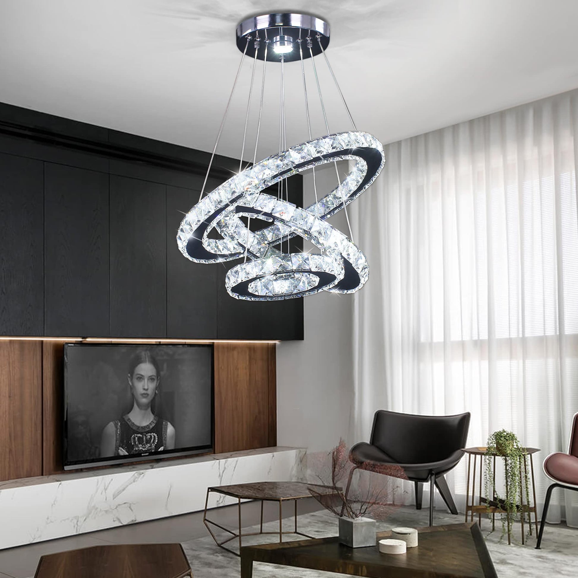 xychfantligh Modern 3 Ring Round Crystal Chandelier Adjustable Stainless Steel Pendant Lighting LED Crystal Ceiling Light Fixture for Living Room Dining Room Bedroom (Cool White)