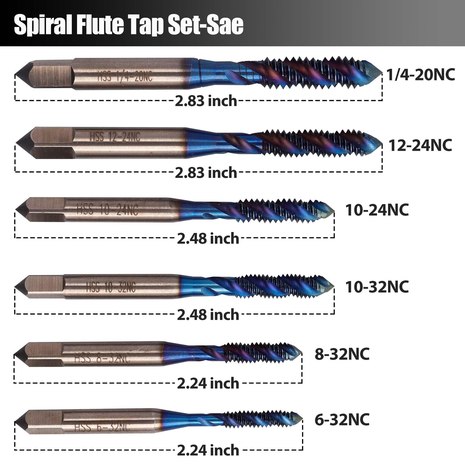 - 6-Piece SAE Tap Set: Includes the most commonly used sizes: 6-32NC, 8-32NC, 10-24NC, 10-32NC, 12-24NC, and 1/4-20NC, covering a wide range of threading needs.