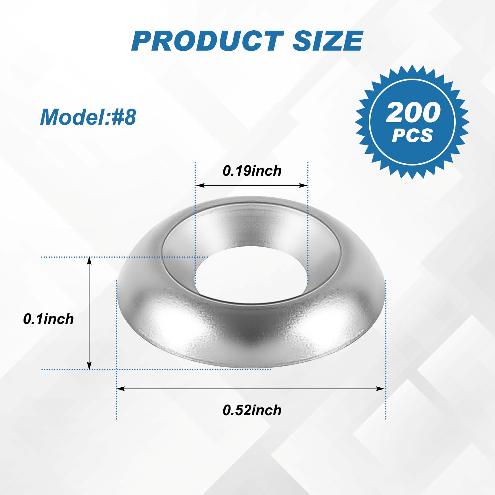 Yaocom 200 Qty #8 Countersunk Finish Washers 304 Stainless Steel Finishing Washers Cup, Silver