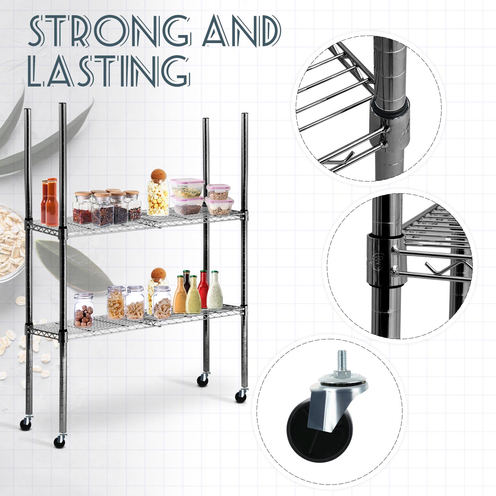 - Enhanced Mobility and Stability: thanks to the 4 caster wheels included in our package, you can smoothly move your shelves around with ease; More so, the wheels come with brakes for instant immobilization for stability; Even on uneven surfaces, the design of our chrome posts for wire shelving ensures balance, preventing your items from toppling
