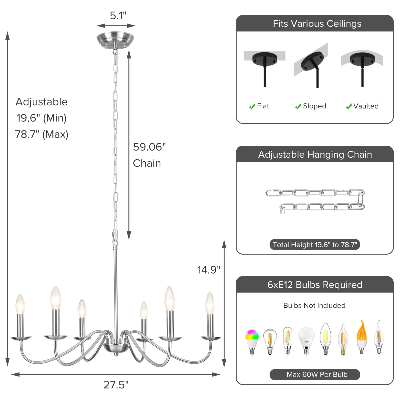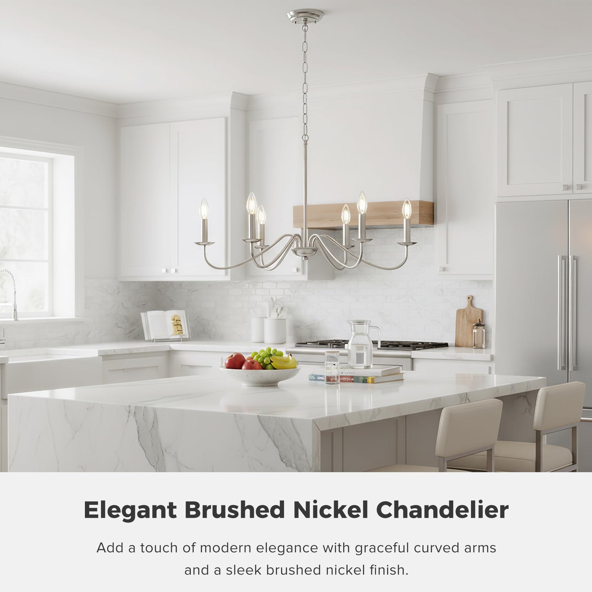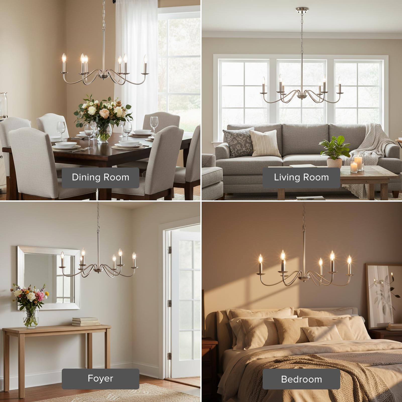 - ✅ Modern Farmhouse Elegance — This brushed nickel chandelier with six candle-style bulbs brings rustic charm and sleek style. Perfect for kitchens, dining rooms, bedrooms, entryways, and living rooms.