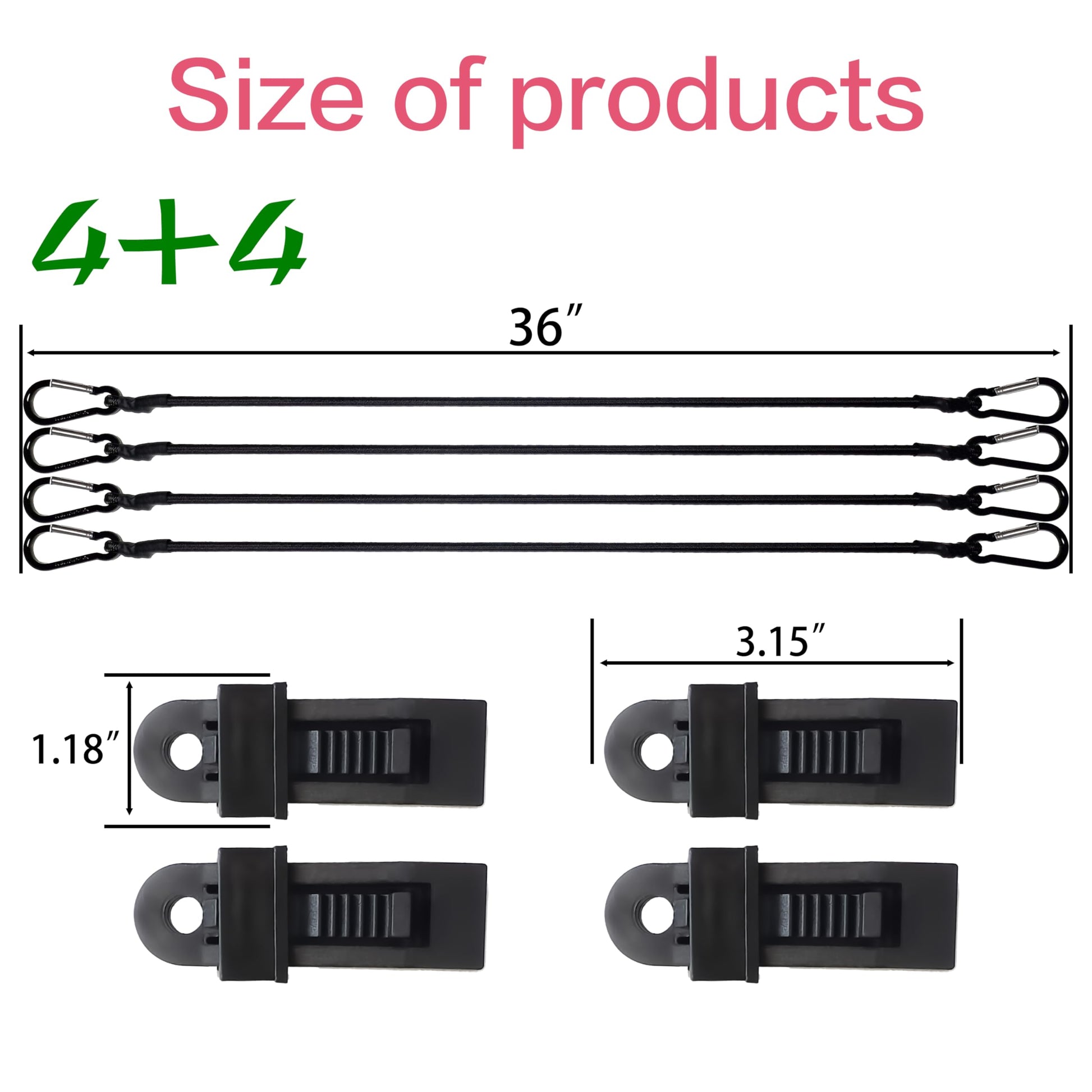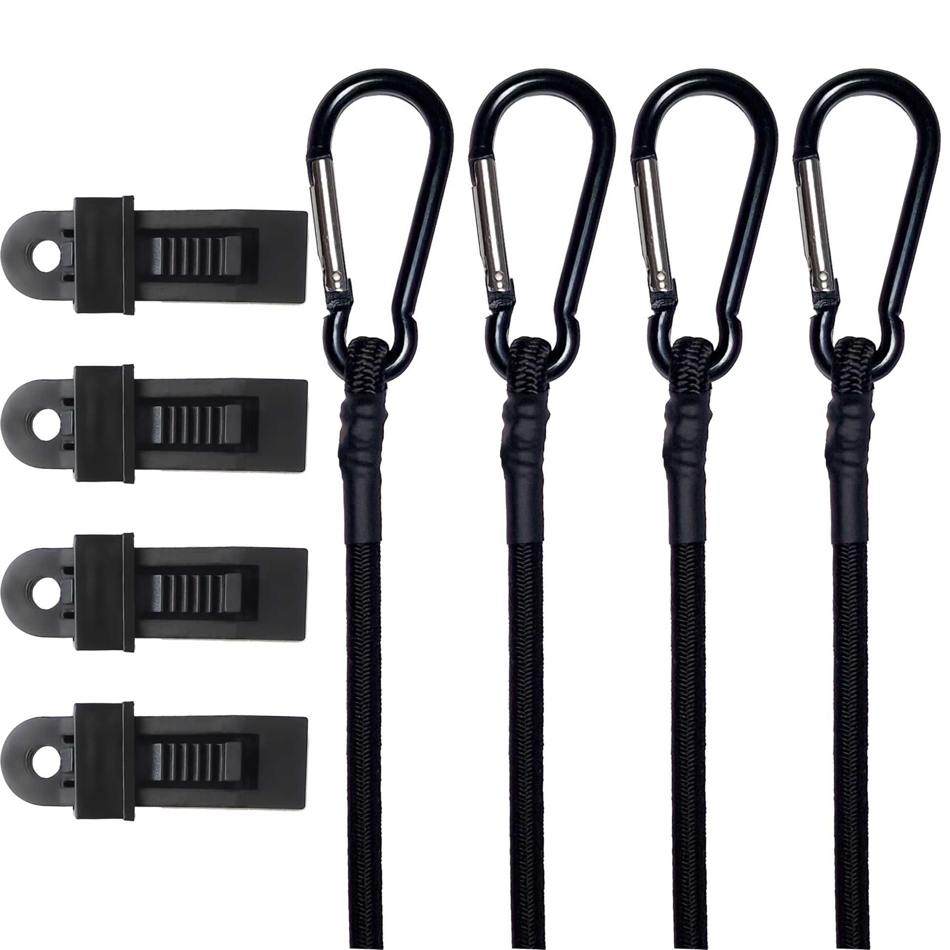 Details: The YELIER 36-inch Bungee Cord Set includes 4 heavy-duty elastic cords with carabiner hooks and 4 crocodile mouth tarp clips, designed for versatile outdoor and everyday securing needs. The natural latex core provides strong elasticity while the polypropylene braided exterior enhances durability and abrasion resistance. Metal carabiners ensure stable and quick attachment and detachment. The crocodile mouth tarp clips clamp tightly onto various fabrics, perfect for securing tents, tarps, and waterproof covers. Made from safe, odor-free materials, this set guarantees user safety. Whether camping, moving, or organizing your garden, the YELIER bungee cord set offers reliable support for all your fastening tasks.