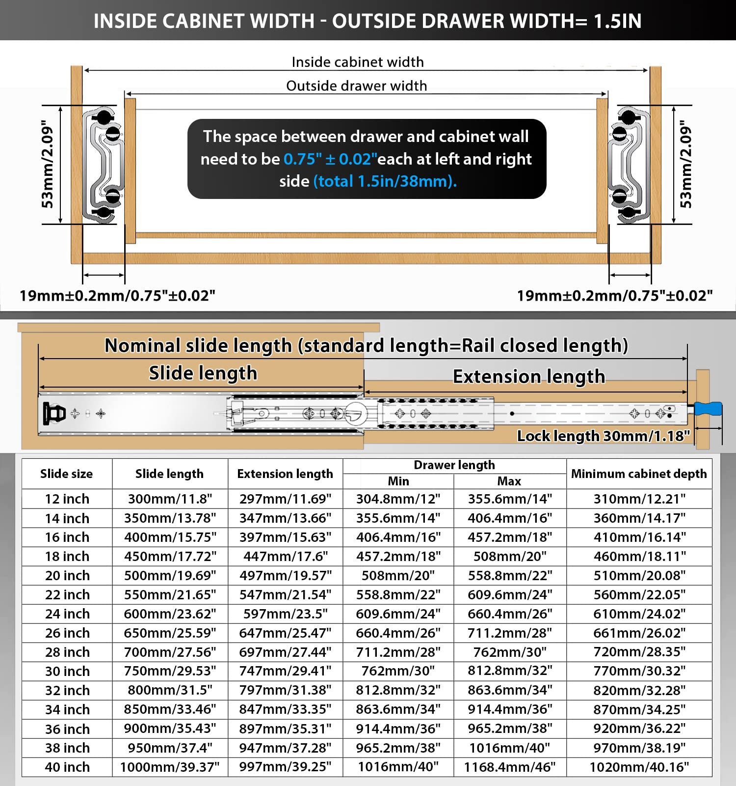 - 📏Installation Note: Fits drawers with internal depth ≥ 30"-32"; requires 0.75in gap on each left/right side between drawer and cabinet wall, totaling 1.5in (internal cabinet width - external drawer width = 1.5in). ⚠️Installation Note: Ensure the two slide rails are parallel during installation, and keep the drawer-side slide and cabinet-side slide horizontally aligned and parallel. 🔩Hardware Note: Mounting screws not included; please purchase M5 screws of appropriate specifications based on your specific installation scenario.