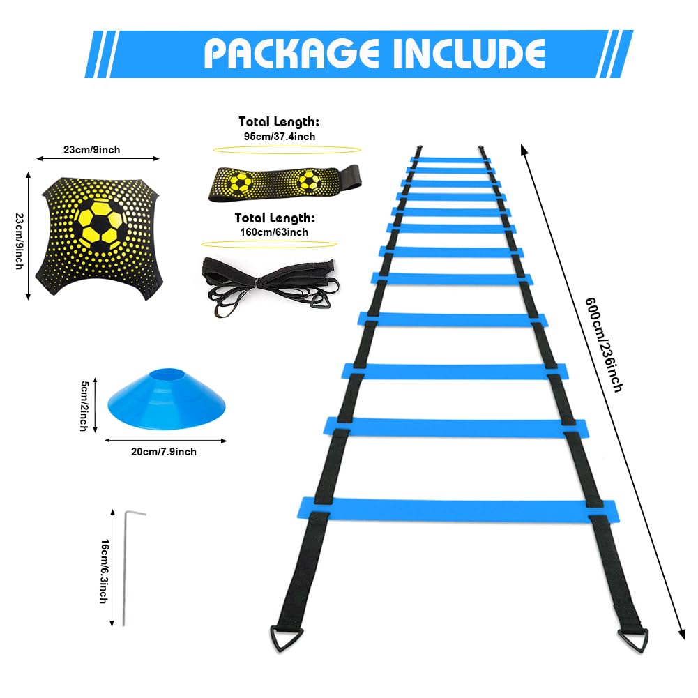 - [Complete Sports Training Set] Footwork Drills, improve football skills, this is a comprehensive football training equipment! Each kit includes a 12 rung 6M agility ladder, 12 soccer cones(6 blue, 6 red), 1 Football Kick Trainer, 4 steel stakes for added stability, and a carrying bag.