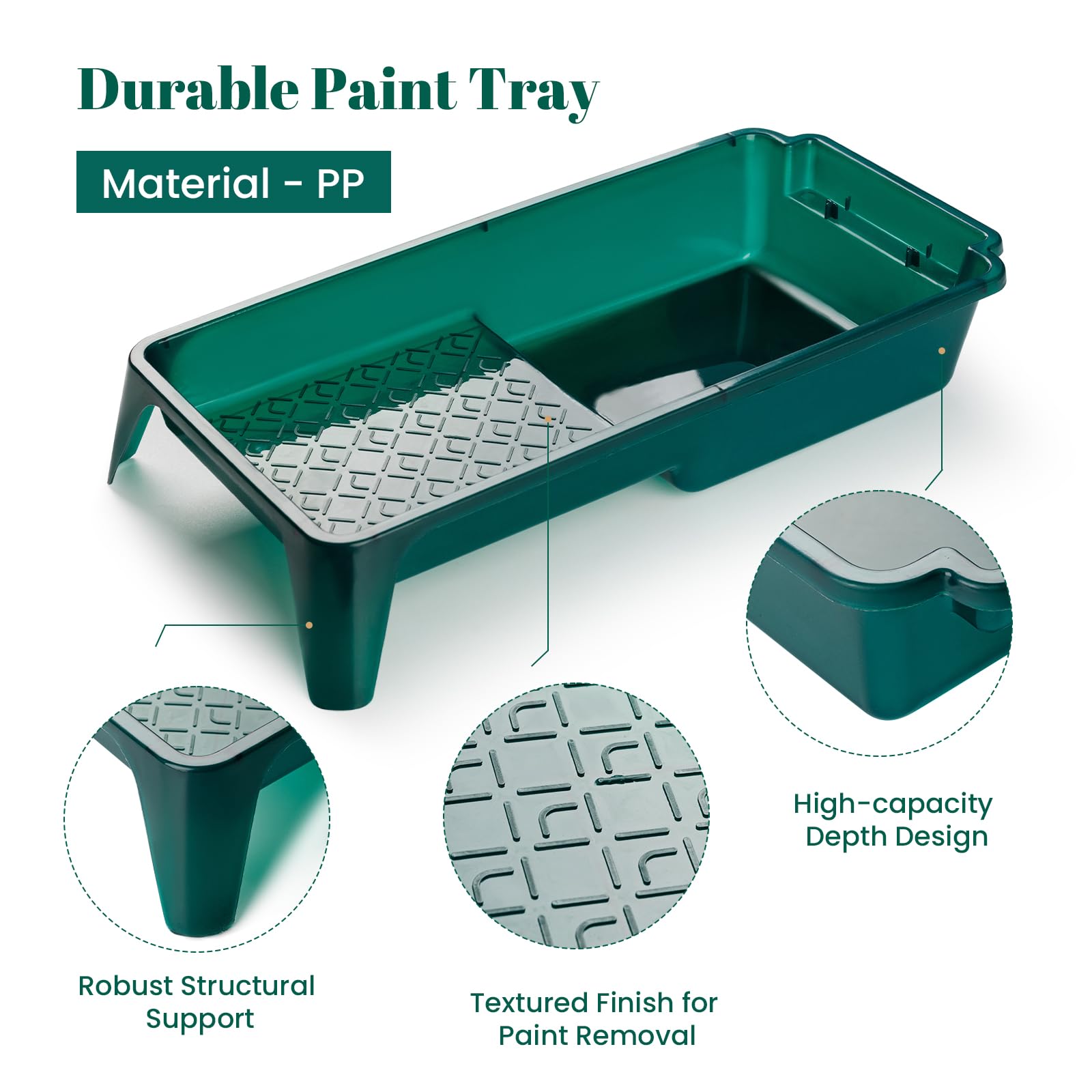 - The 4-inch paint roller tray is made of high-quality PP and can be used repeatedly without warping or cracking. Textured surfaces on trays and pan liners ensure even distribution of paint on the roller, providing smooth coverage
