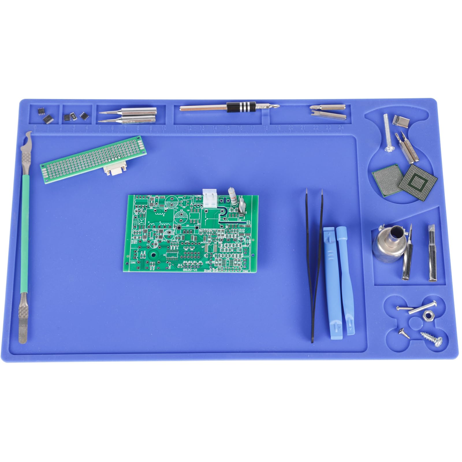 - Multiple Functional Zones: Soldering mat features 5 square storage slots at the upper part including 1 slot for screwdriver; built-in ruler can measure up to 24cm, making it easy to measure parts directly on the silicone mat; 3 storage slots on the right side to hold components like SMD components, screws, and more