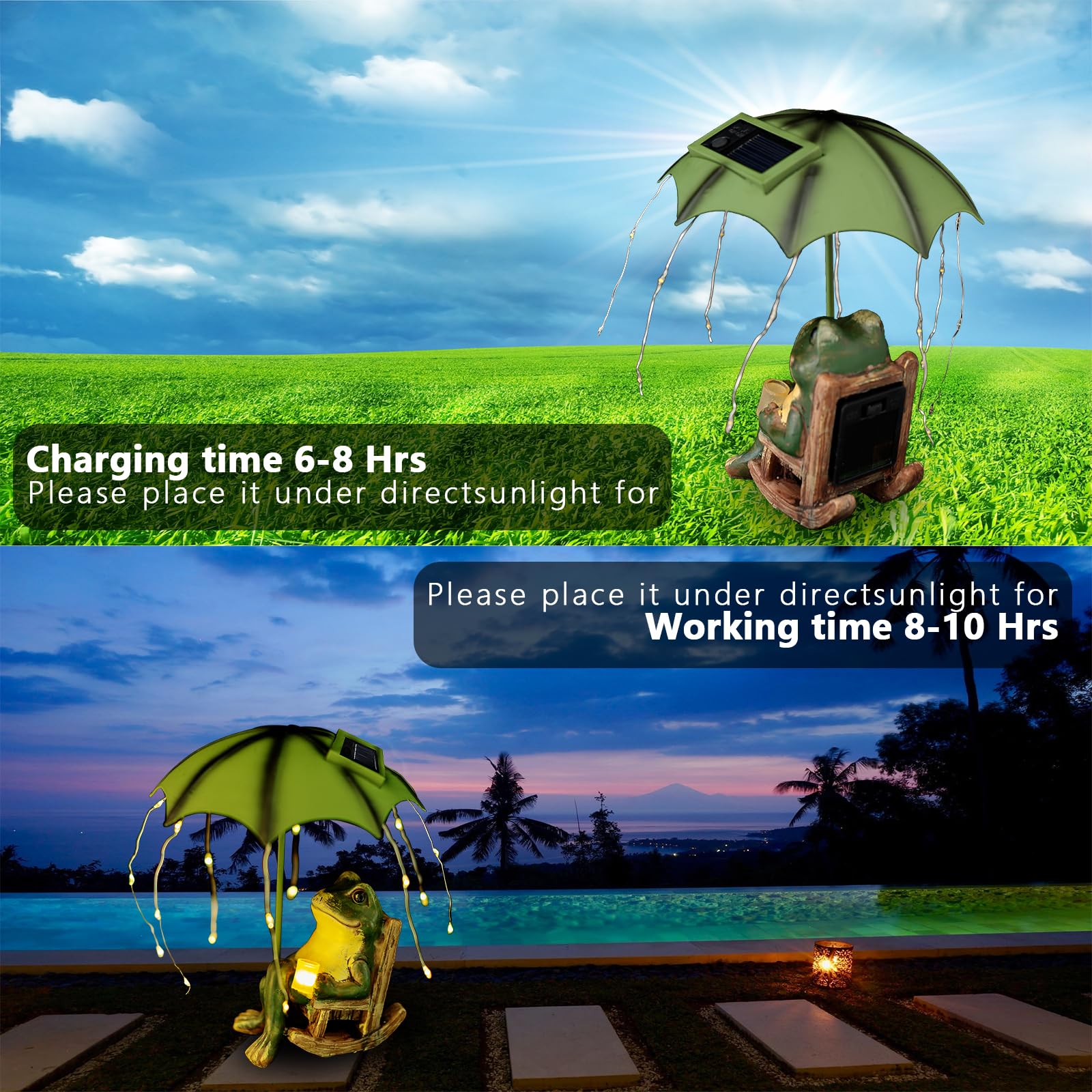 - 【 Ideal Gift 】Solar lights frog statues outdoor garden is full of creativity, statue and light combination of creative design, frog statue suitable for garden/lawn/porch/patio/pond/yard.Cute frog statues is the perfect garden gift for mother/lover/child/gardener!