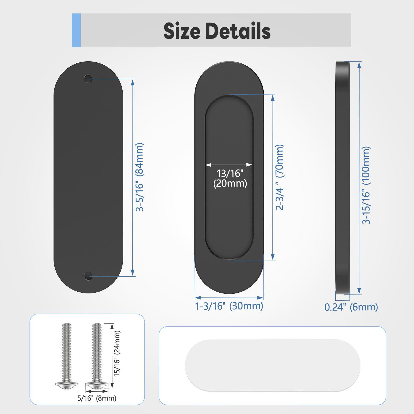- Product Packing: Comes with 2 * Black barn door knobs, strong double sided tapes and matching screws. The adhesive handle length: 3-15/16"(100mm), width: 1-3/16"(30mm), thickness: 0.24"(6mm), screw length: 15/16"(24mm)