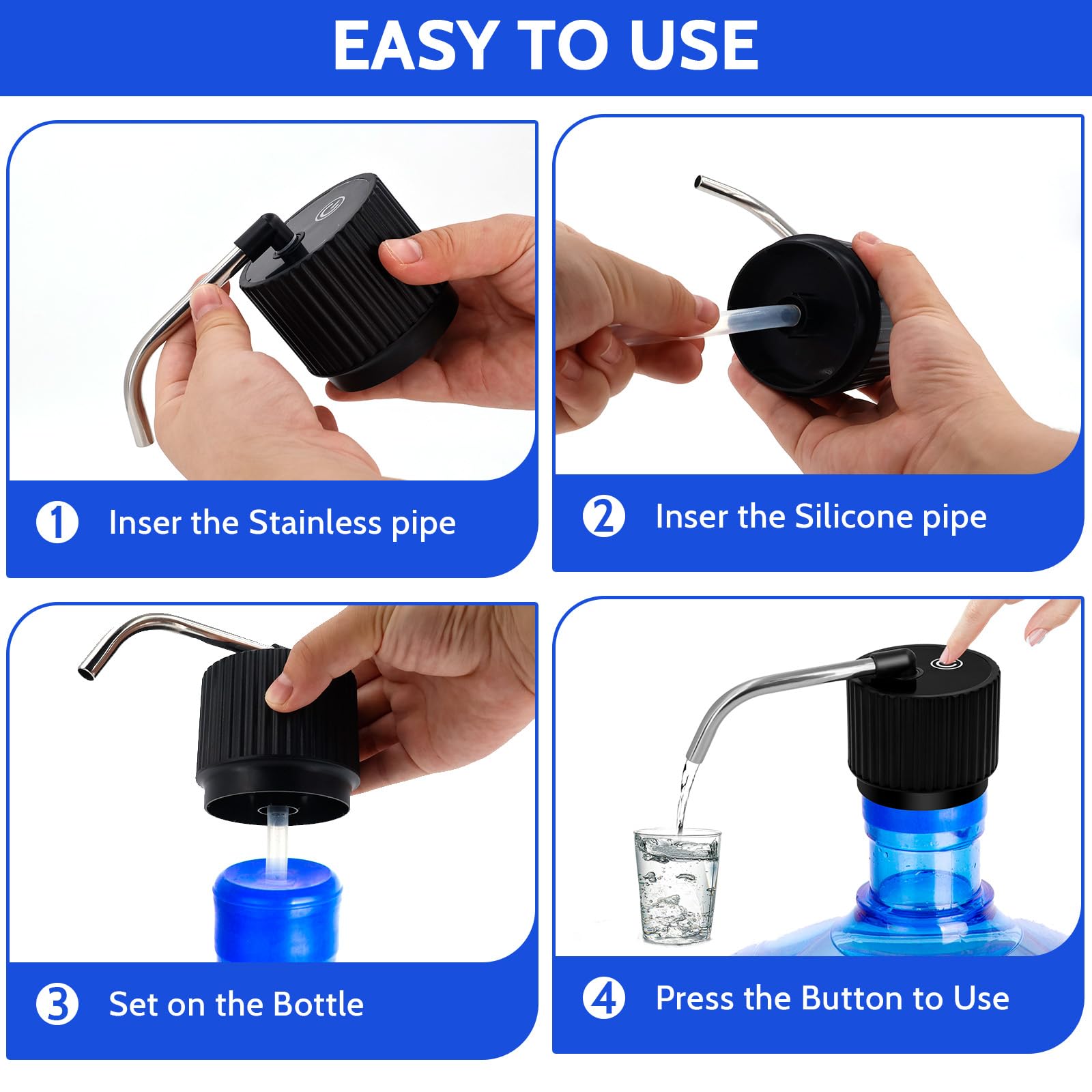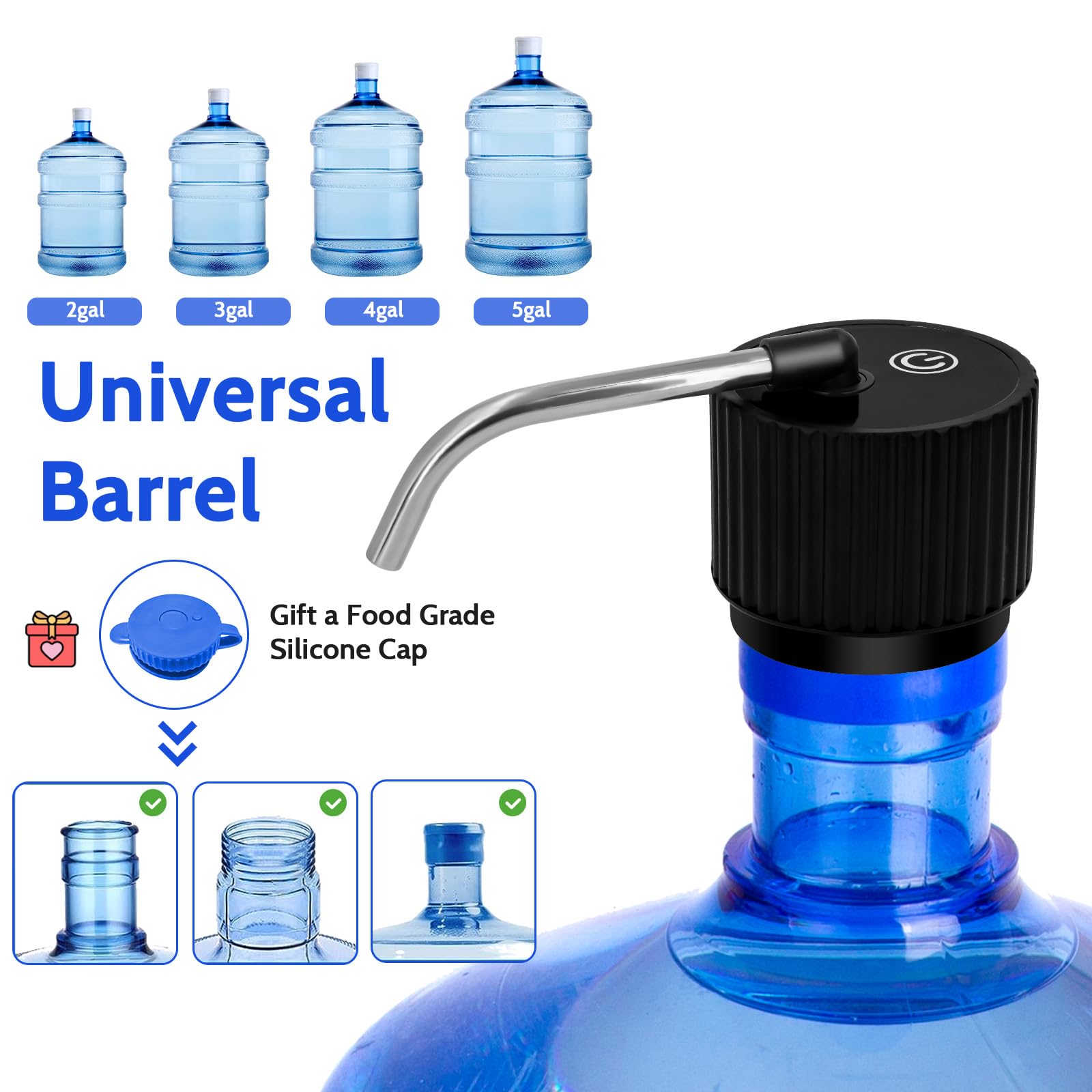 - EASY TO USE: The electric water dispenser fits 3-5 gallon universal-size bottles, and we also provide free silicone lids to fit many types and sizes of buckets to use.Simply attach the water bottle pump to the mouth of the bottle and operate it with one click.