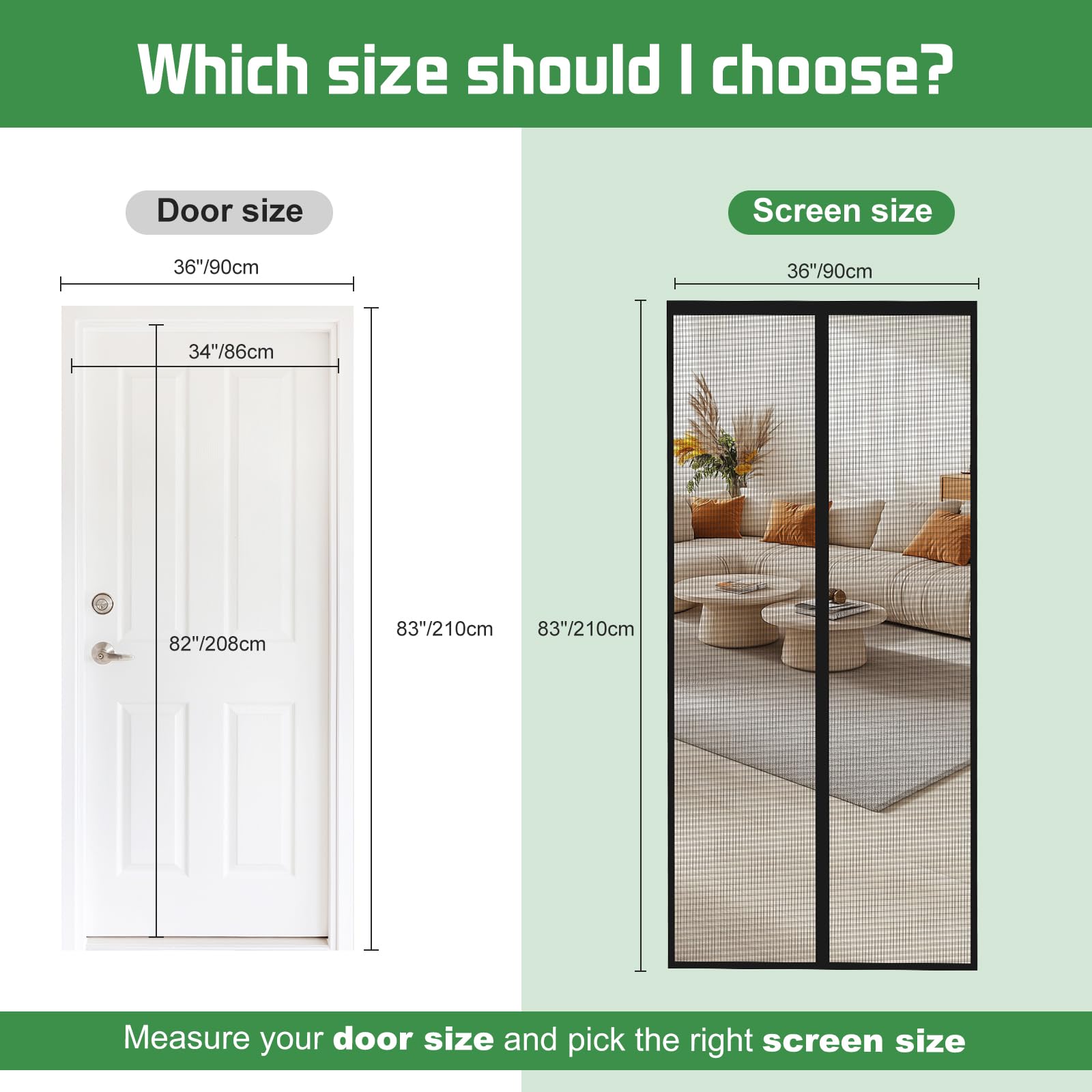 - Measurement Before Purchase - The outer size of magnetic door screen is 36" x 83" , suitable for doors with interior width of 33"-34" and interior height of 80"-81". Please measure your home's door before purchase to choose the right screen for door.