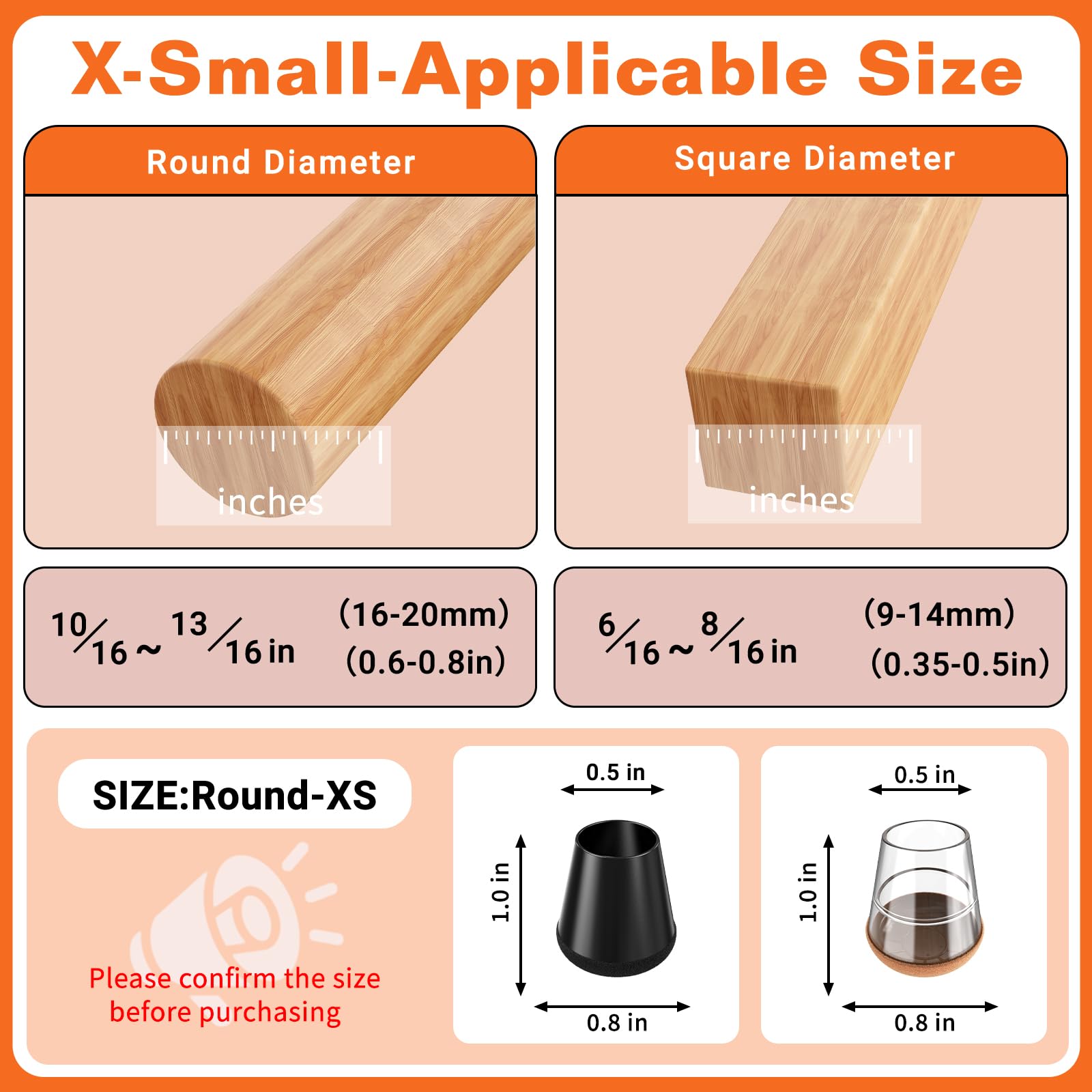 - Applicable Size Range:Extra small Chair leg Floor Protectors Buying Tips.Please measure the chair leg diameter.Fit Round leg diameter:0.6" to 0.8"(16-20 mm).Fit Square leg diameter:0.35" to 0.5" (9-14 mm)