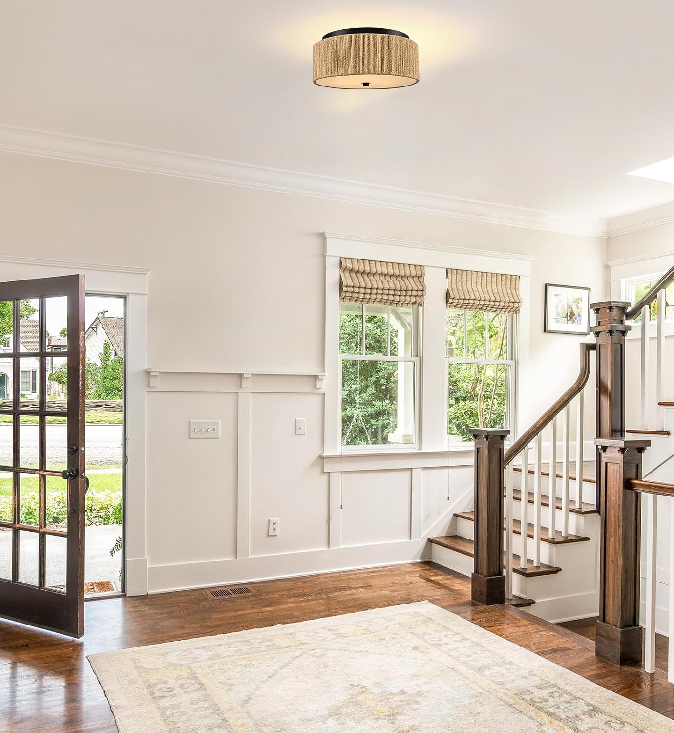 YUBOLE Woven Ceiling Light 3-Light Bohemian Flush Mount Ceiling Light with Paper Hemp Rope Drum Shade for Bedroom Hallway Bathroom Dining Room-Black & Brown