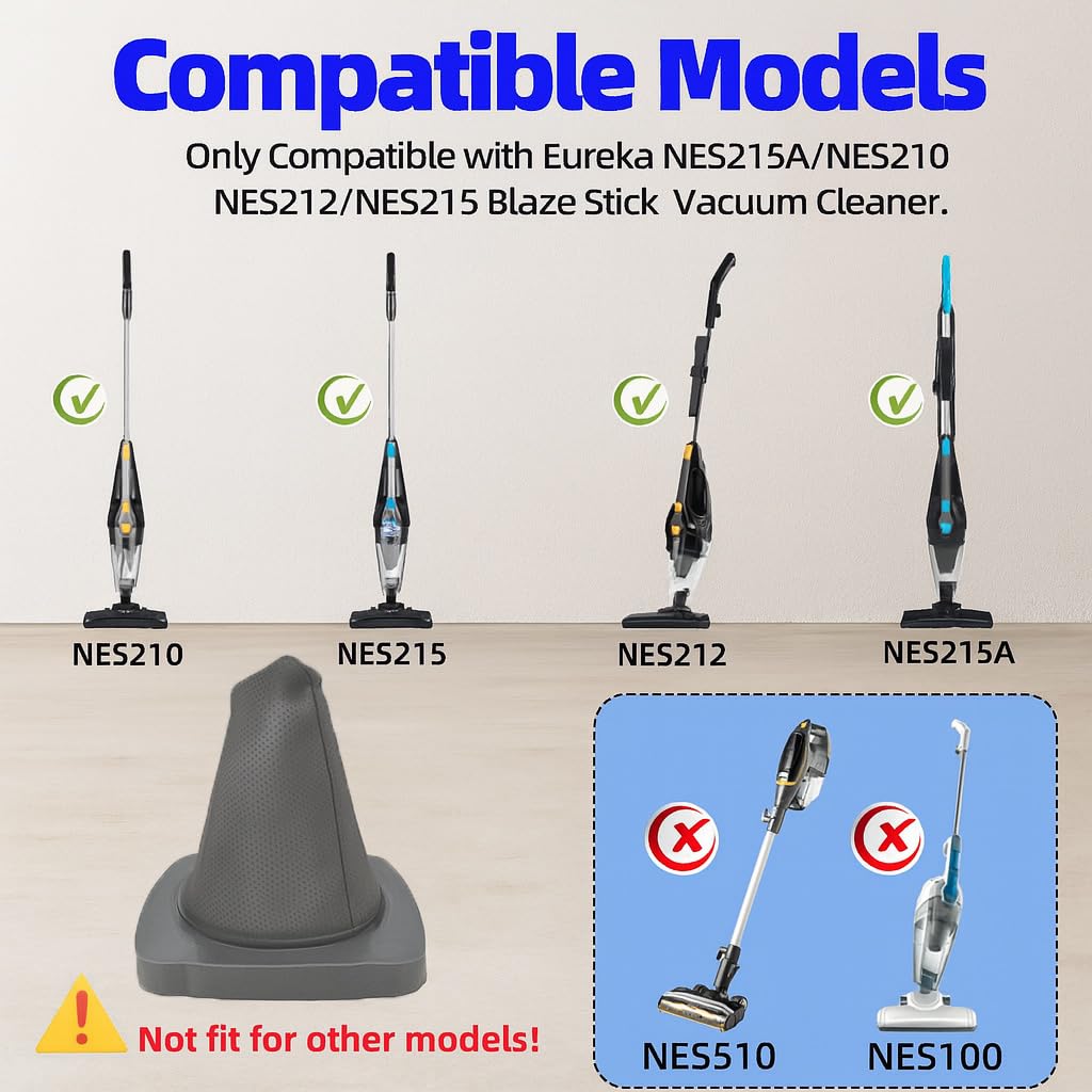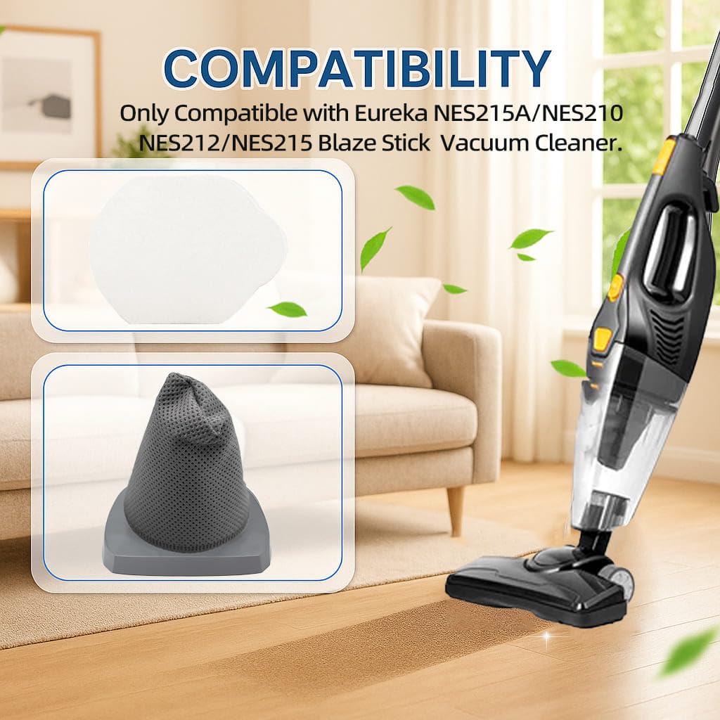 Details: YUJINRU replacement filter is only compatible with Eureka NES215A/ NES210/ NES212/ NES215 Blaze Stick Vacuum Cleaner, Fits Model N0101 N0102 Series,2 Pack Vacuum Filters & 2 Pack Pre-Motor Filters.(Please confirm your machine model number before purchase)