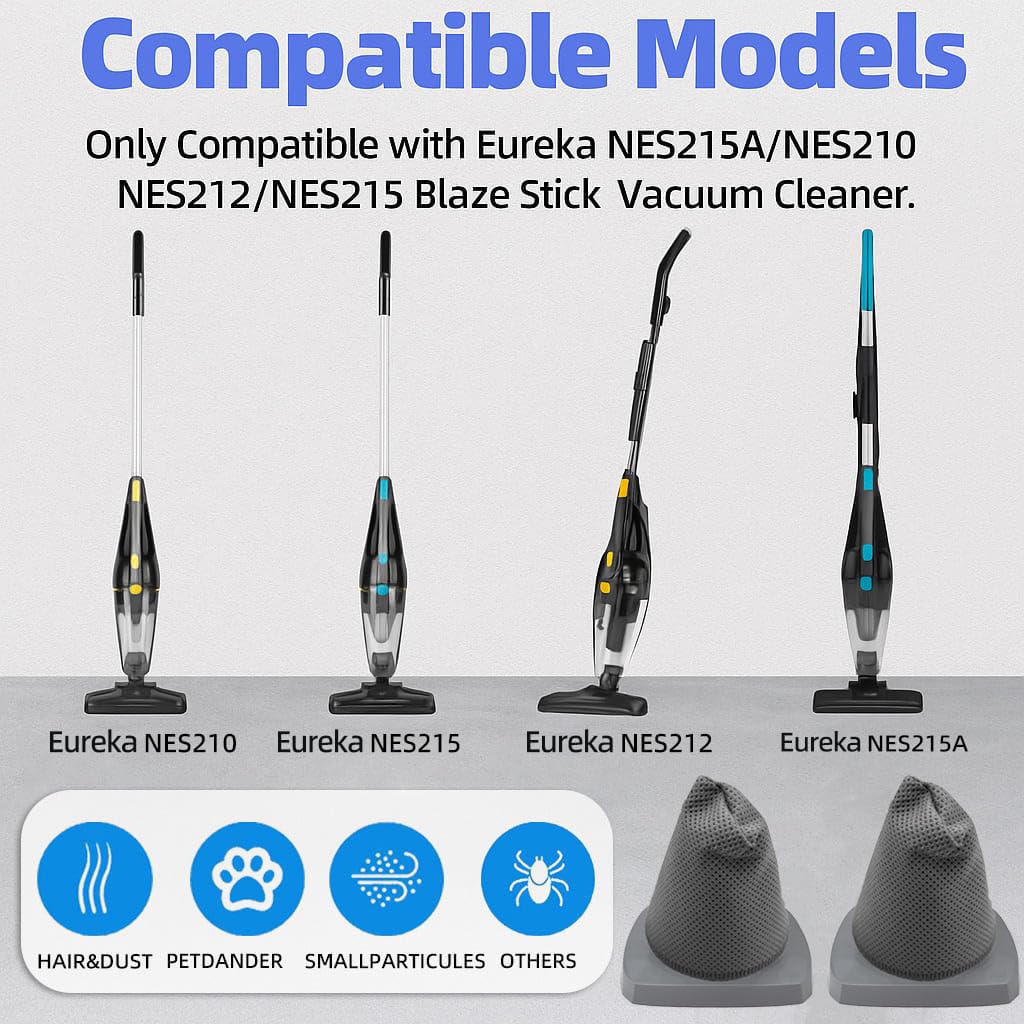 - YUJINRU replacement filter is only compatible with Eureka NES215A/ NES210/ NES212/ NES215 Blaze Stick Vacuum Cleaner, Fits Model N0101 N0102 Series,2 Pack Vacuum Filters & 2 Pack Pre-Motor Filters.(Please confirm your machine model number before purchase)