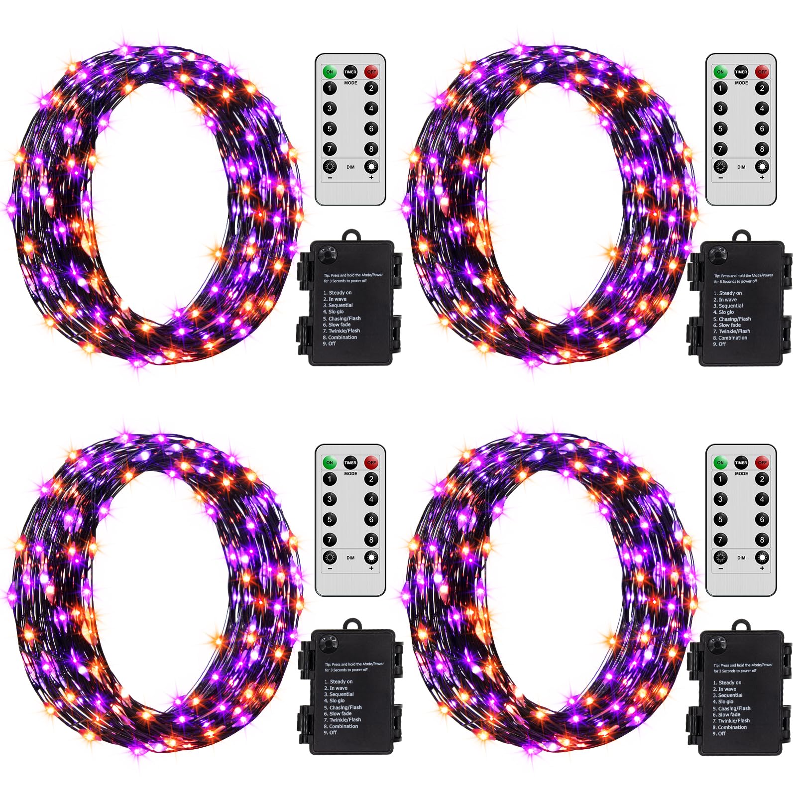 ZAIYW Halloween Fairy Lights Battery, 4 Pack 16.5Ft 50 LED Fairy Lights with Remote Control Timer 8 Modes, Black Copper Wire Twinkle Lights for Indoor Outdoor Halloween Decor (Purple Orange)