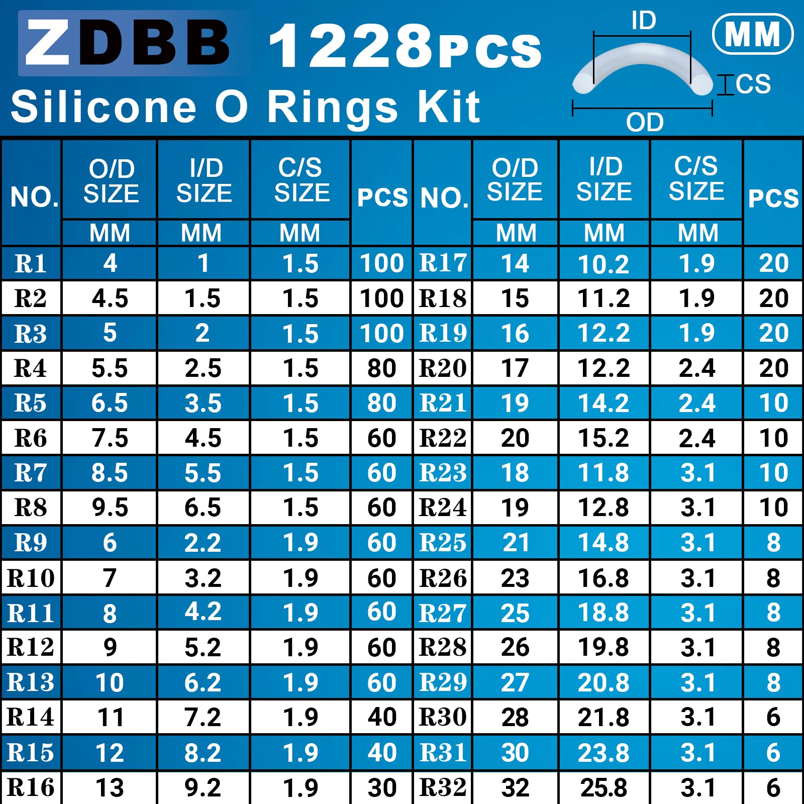 ZDBB 32 Size 1228 PCS Clear Food Grade Silicone O-Ring Kit, White Oil and Heat Resistant VMQ Seal O-Ring Washer Set for Sealing Faucets and Plumbing with Hook and Pick
