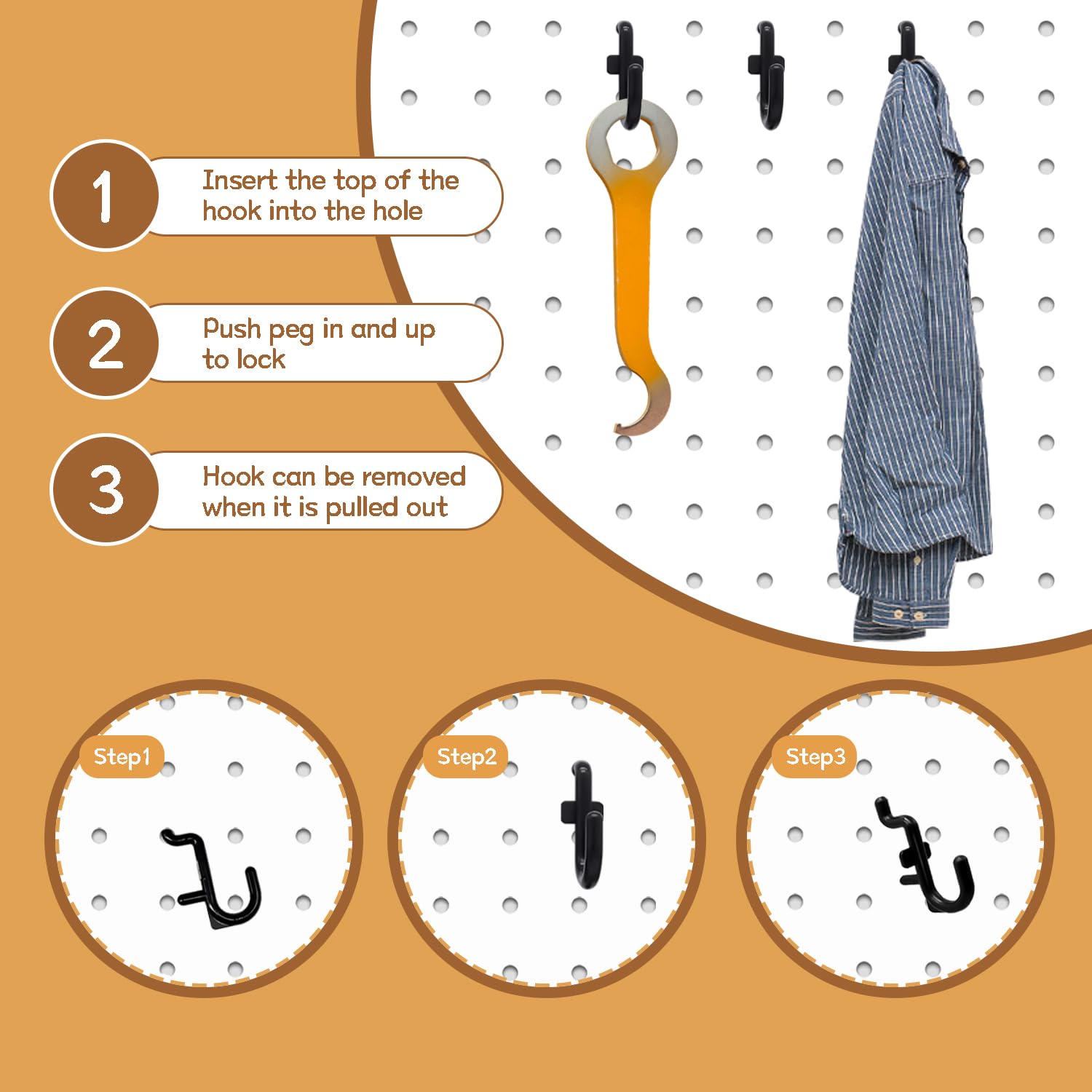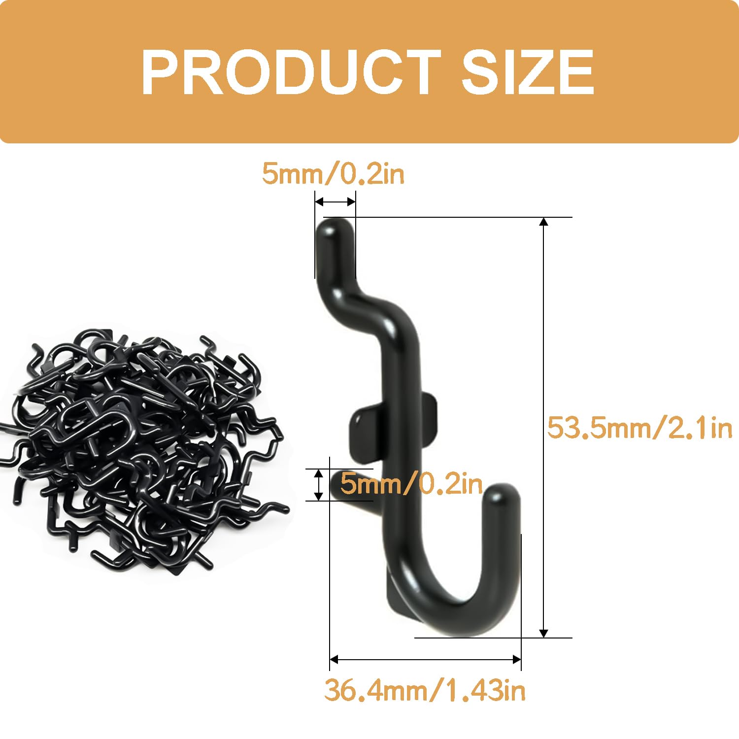 - 【PRODUCT SIZE】The color of the peg hooks are black, you will get 100pcs J hooks by using the 1/4 "installation hole pegs for pegboard