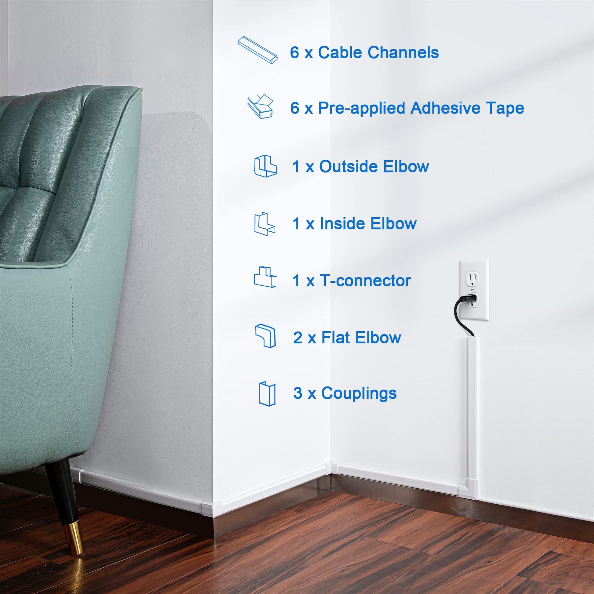 - Easy to Use with Great Variety Accessories: This cable cover wall kit includes 3 couplings, 2 flat elbows, 1 T-connector, 1 inside elbow and 1 outside elbow. In wiring scenarios where you need to go through corners and turns, these accessories can easily turn the line and hide the rough cutting surface after DIY