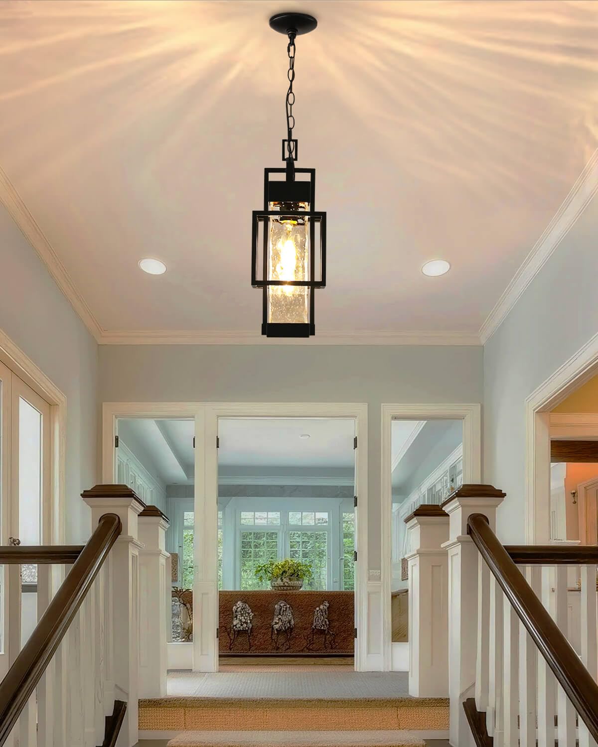 - Versatile Hanging Ceiling Lantern for Multiple Scenes - Whether you're lighting your entryway, gazebo, or outdoor patio, this exterior pendant light adds elegance, warmth, and security. Its clean, modern lines and seeded glass offer both visual interest and practical brightness for any exterior setting.