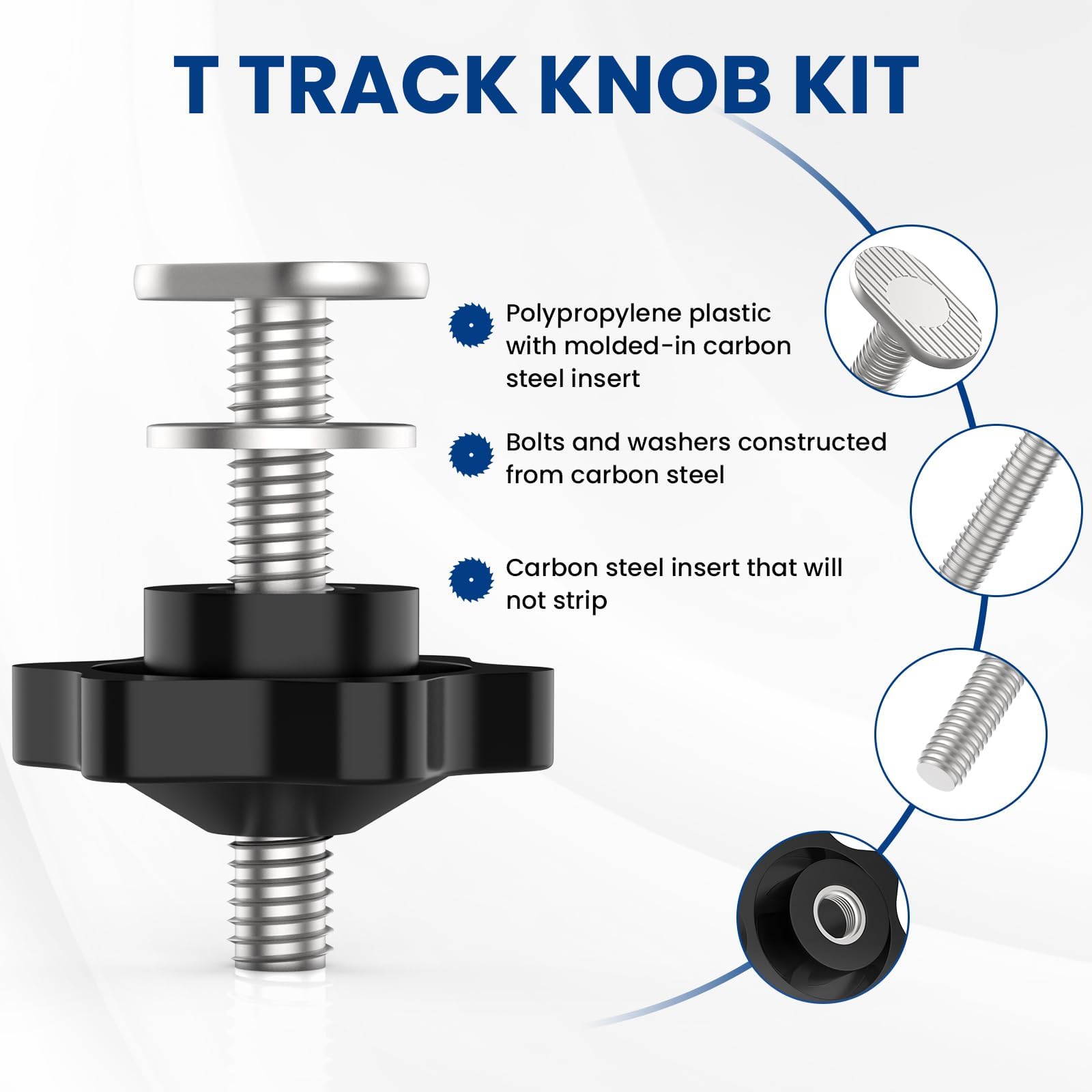 - 𝐏𝐮𝐫𝐩𝐨𝐬𝐞: The T-track knob kit is compatible with any universal tracks, T-tracks, and dual-cut tracks that can accept standard 1/4" bolt heads. Helps to secure various fixtures and fittings while optimizing your favorite T-track components