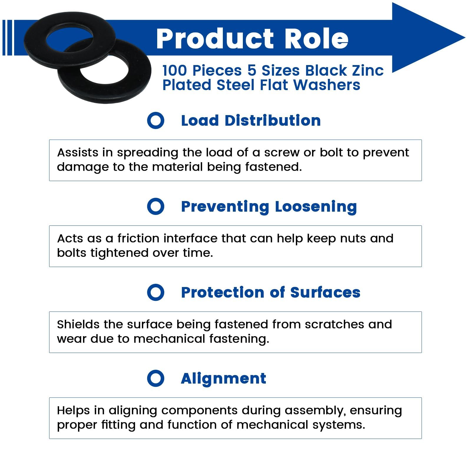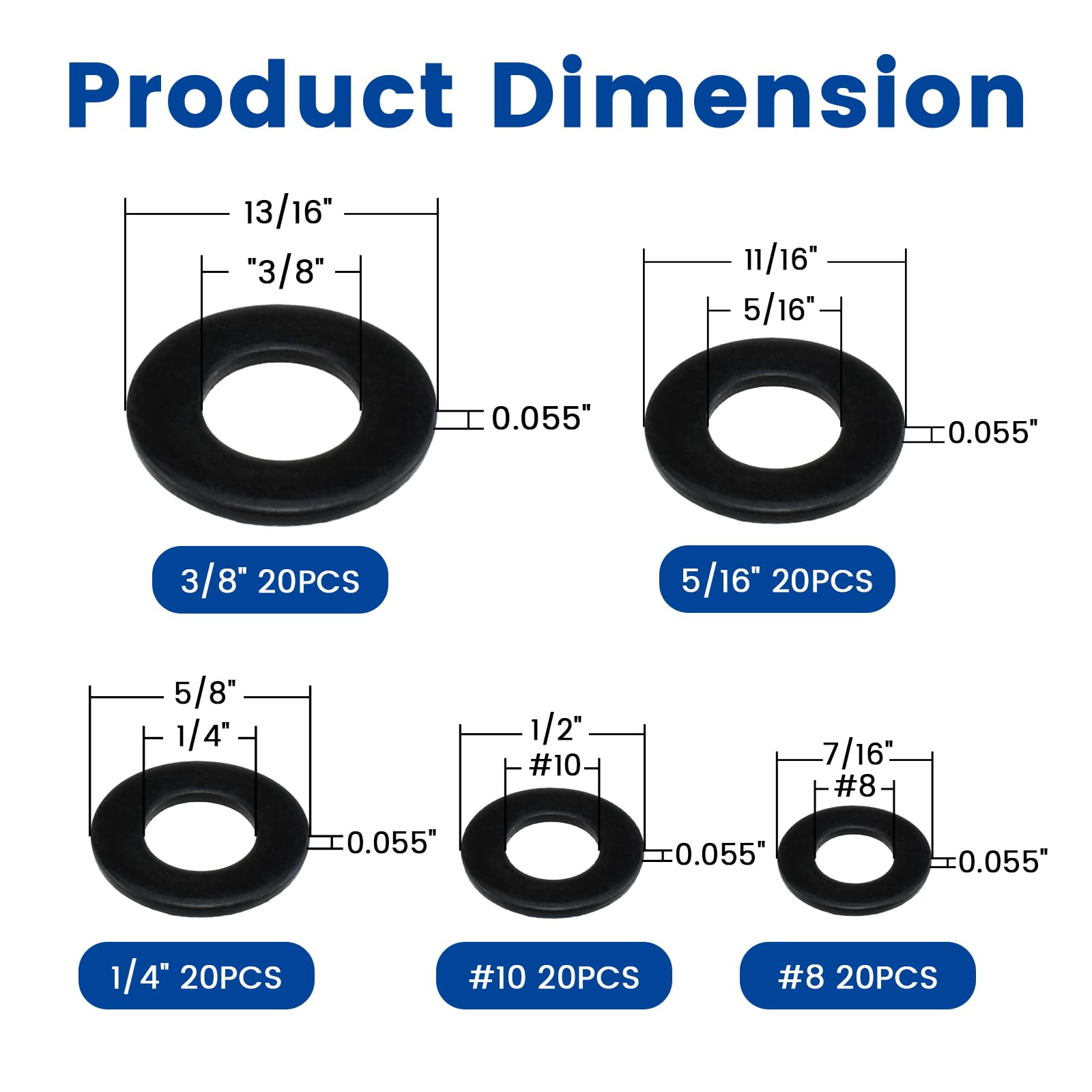 - 𝐏𝐚𝐜𝐤𝐚𝐠𝐞 𝐈𝐧𝐜𝐥𝐮𝐝𝐞𝐬: You will receive 100 pcs black flat washers, including 5 different sizes, 0.188" ID x 7/16" OD(#8), 0.219" ID x 1/2" OD(#10), 1/4" ID x 5/8" OD, 5/16" ID x 11/16" OD, 3/8" ID x 13/16" OD