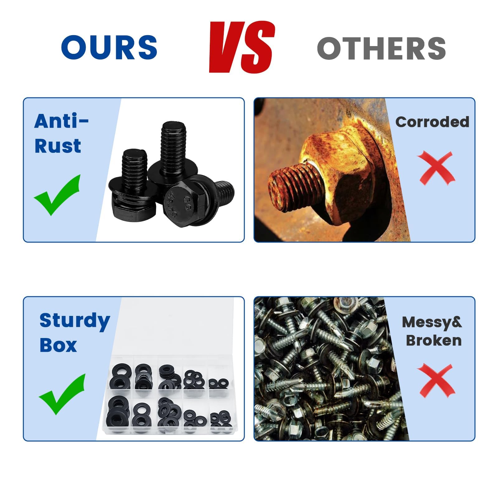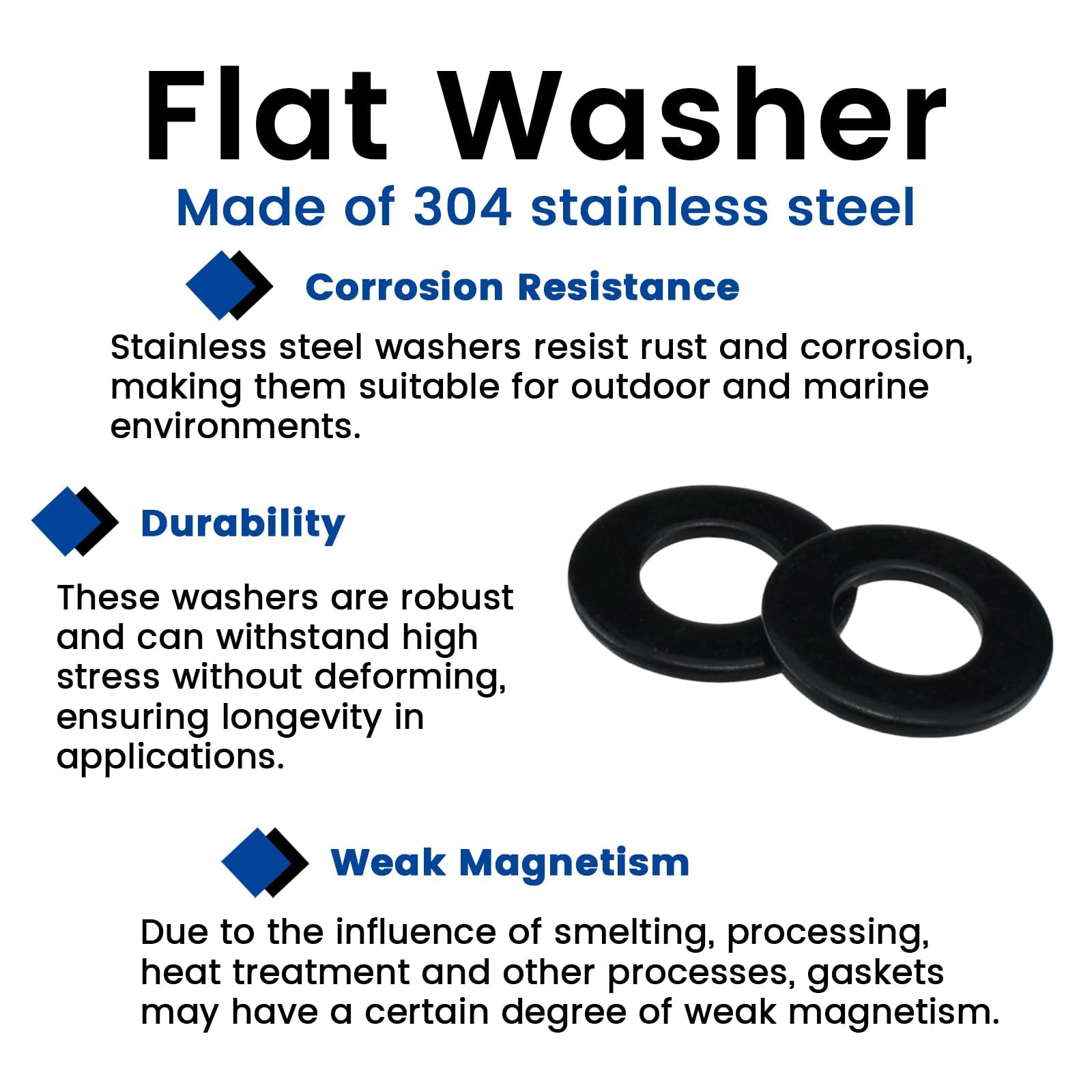 - 𝐌𝐚𝐭𝐞𝐫𝐢𝐚𝐥: The washers assortment kit is made from premium 304 stainless steel with a black zinc plating(It is incorrect to say that if a magnet sticks to stainless steel, it is not stainless steel, and if it does not stick, it is stainless steel. – Due to the influence of smelting, processing, heat treatment, and other processes, it may have a certain degree of weak magnetism.)