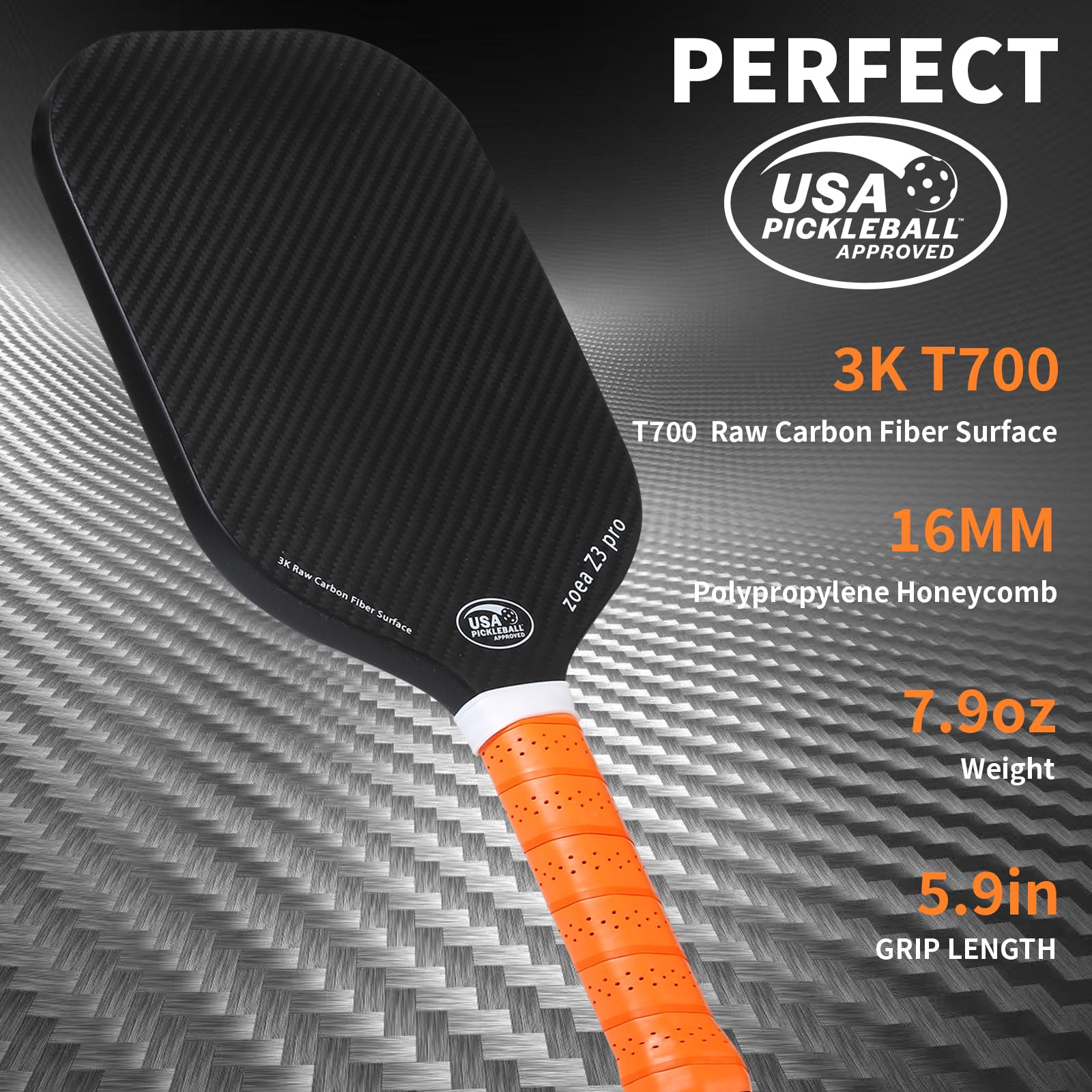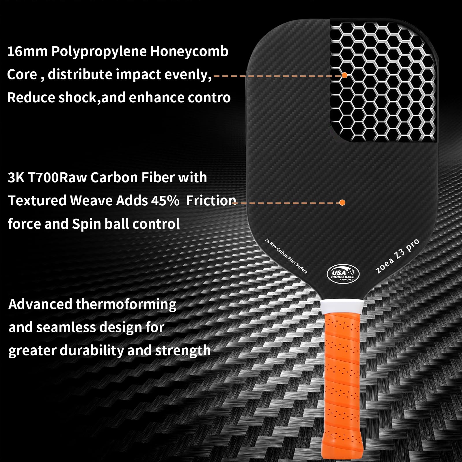 ZOEA Pickleball Paddle, USA Pickleball Approved, 16MM Polypropylene Honeycomb Core, Edgeless Style 3K Raw Carbon Fiber Surface + Carbon Abrasion Surface, Ideal for Novice and Professional Players 1PC