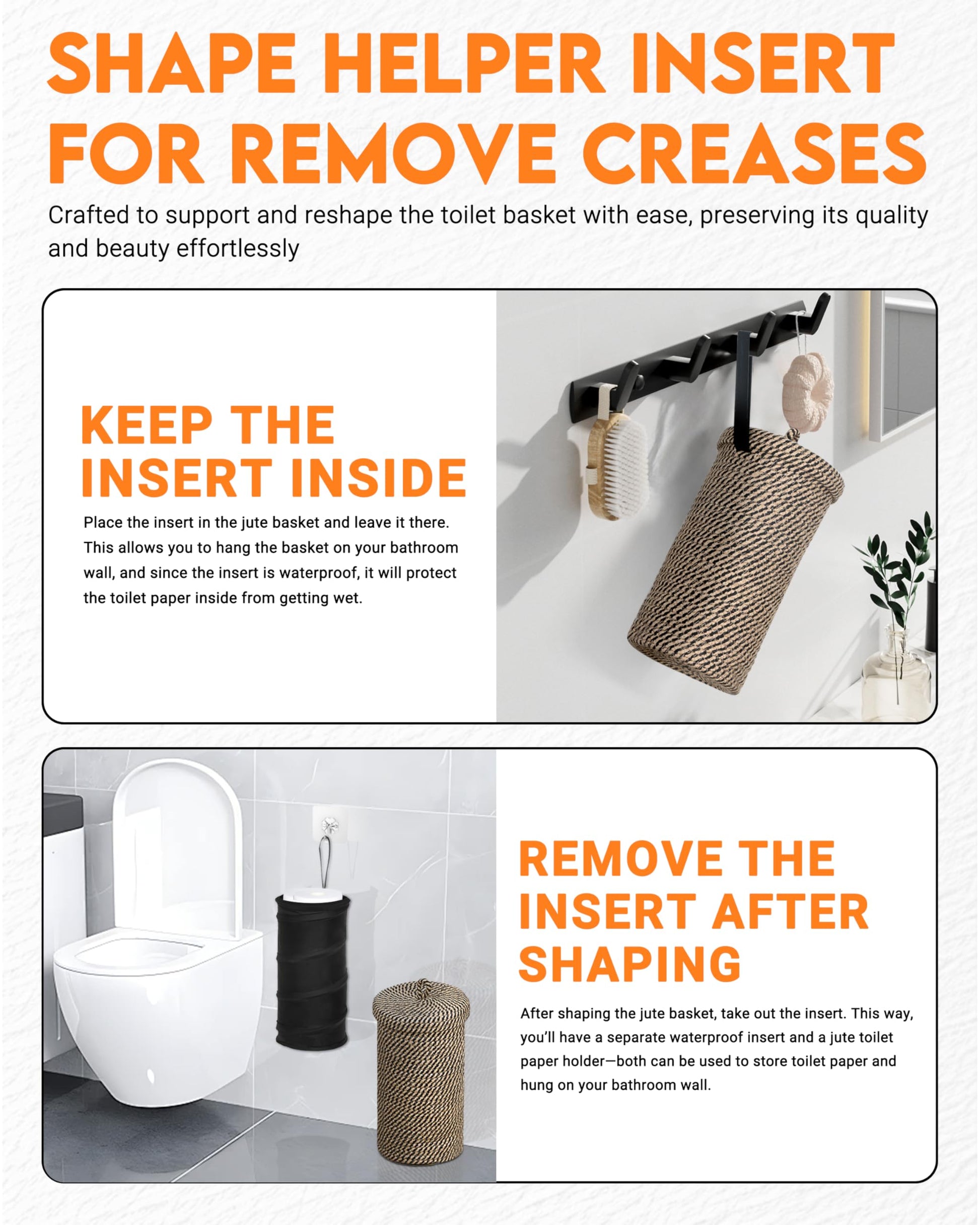 - 【Shape Helper Insert】The product includes a waterproof pop-up basket that can be inserted into the jute toilet basket to help it regain its shape after creasing due to transport folding. The side handle extends through the top opening of the jute toilet paper basket, allowing it to hang on a bathroom hook, adding a decorative touch to your bathroom. Once the jute toilet paper basket has fully regained its shape, we recommend removing the insert.