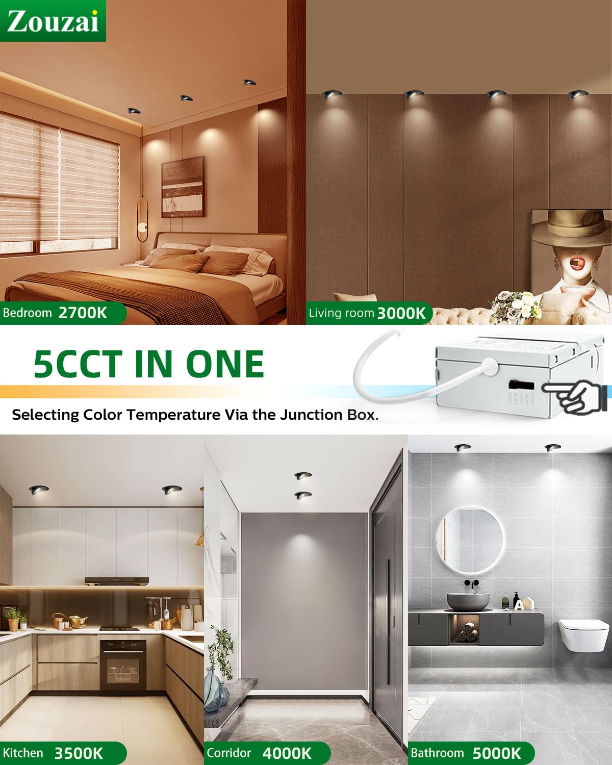 zouzai Classic 4 inch 5CCT Gimbal LED Recessed Light, 360°+90° Adjustable Directional Retrofit Eyeball Can Light with J-Box, Dimmable 2700K/3000K/3500K/4000K/5000K, ETL Certified (Black,12 Pack)