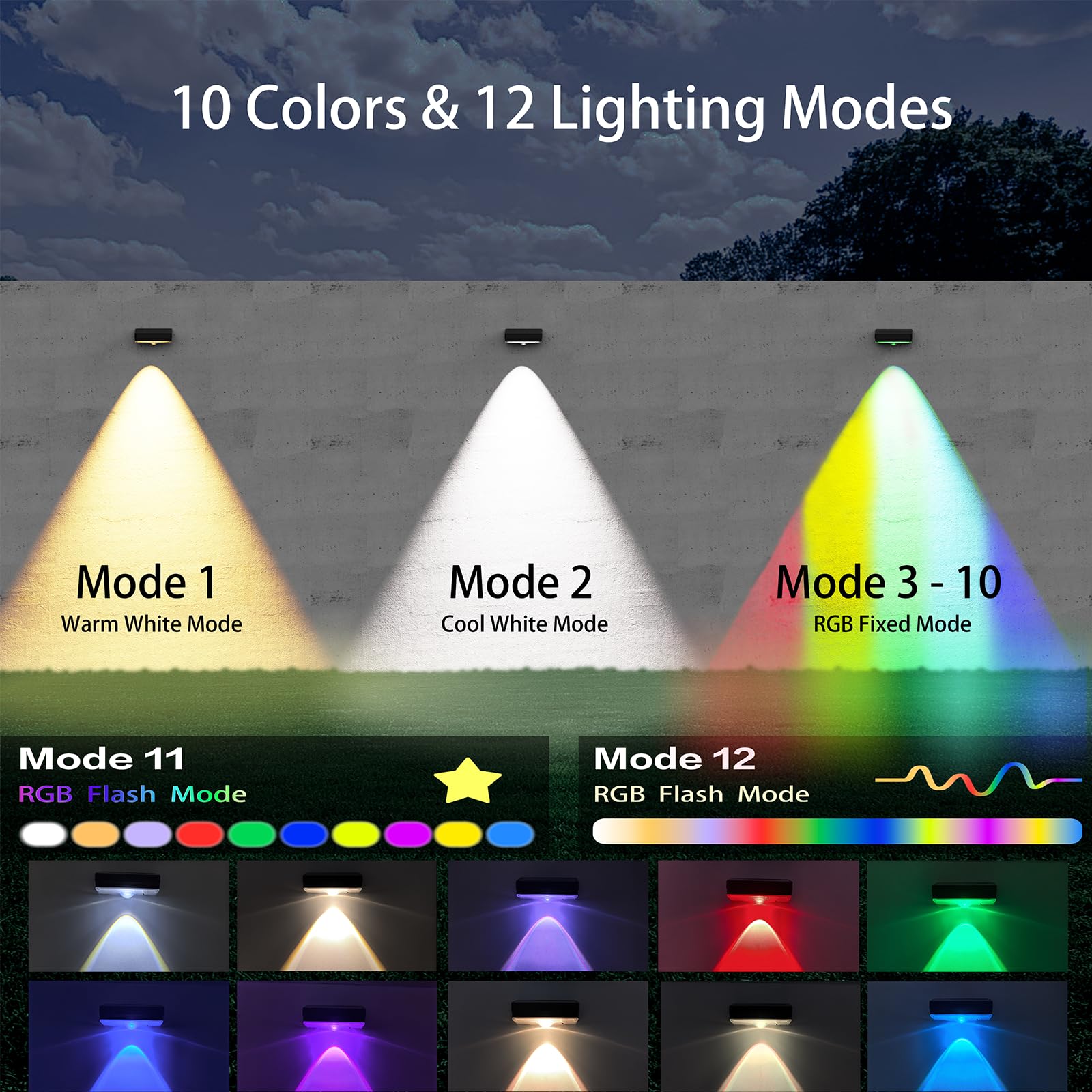 - 【 10 Color Modes 】: This solar wall lamp offers warm white light, cool white light, RGB seven color light, and 7 dynamic color changing modes, which can be cycled through with simple buttons.