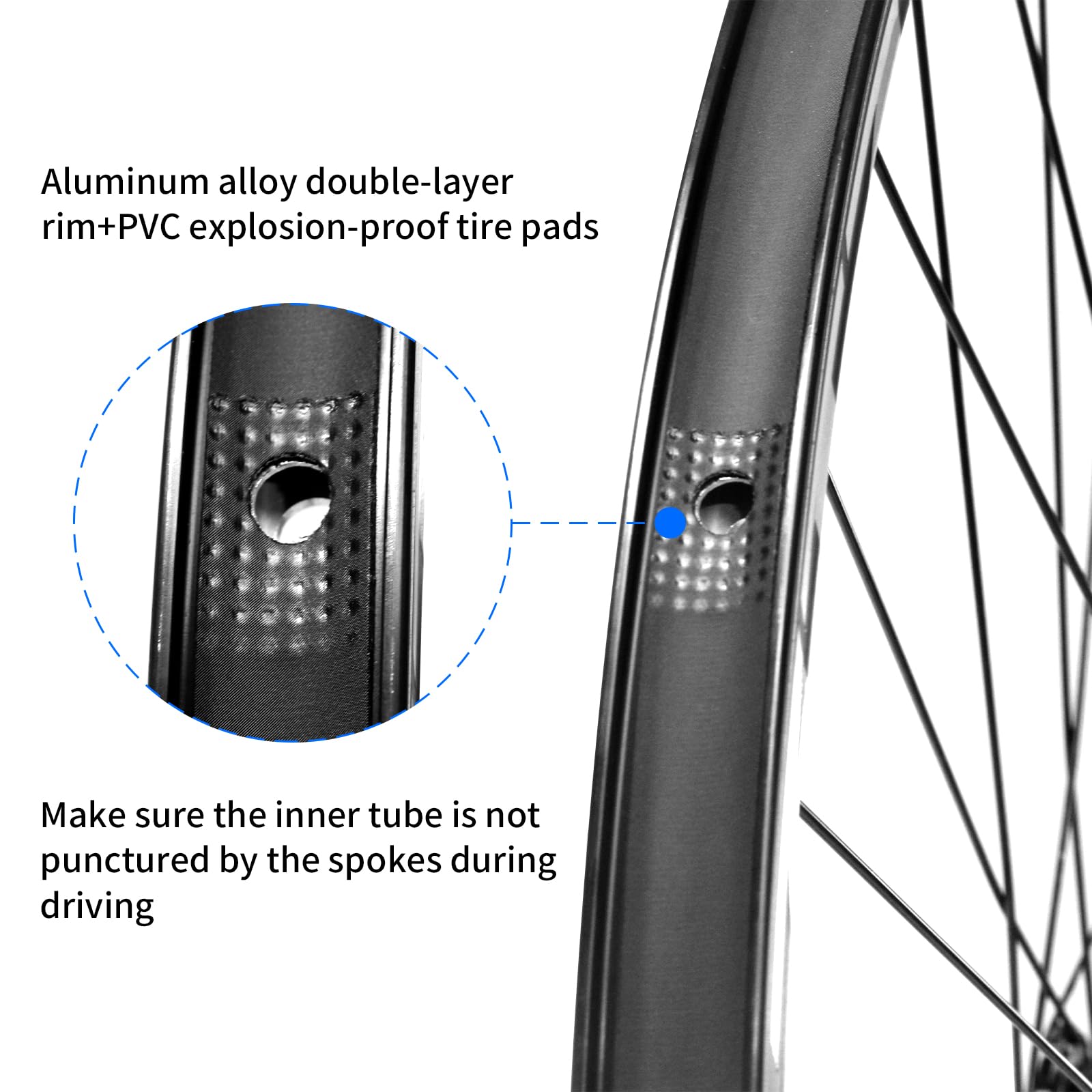 - Protect Inner Tube: The aluminum alloy double-layer rivet rim is equipped with PVC explosion-proof tire pads, Make sure the inner tube is not punctured by the spokes during driving. Trust in our MTB wheel set for a worry-free cycling adventure.