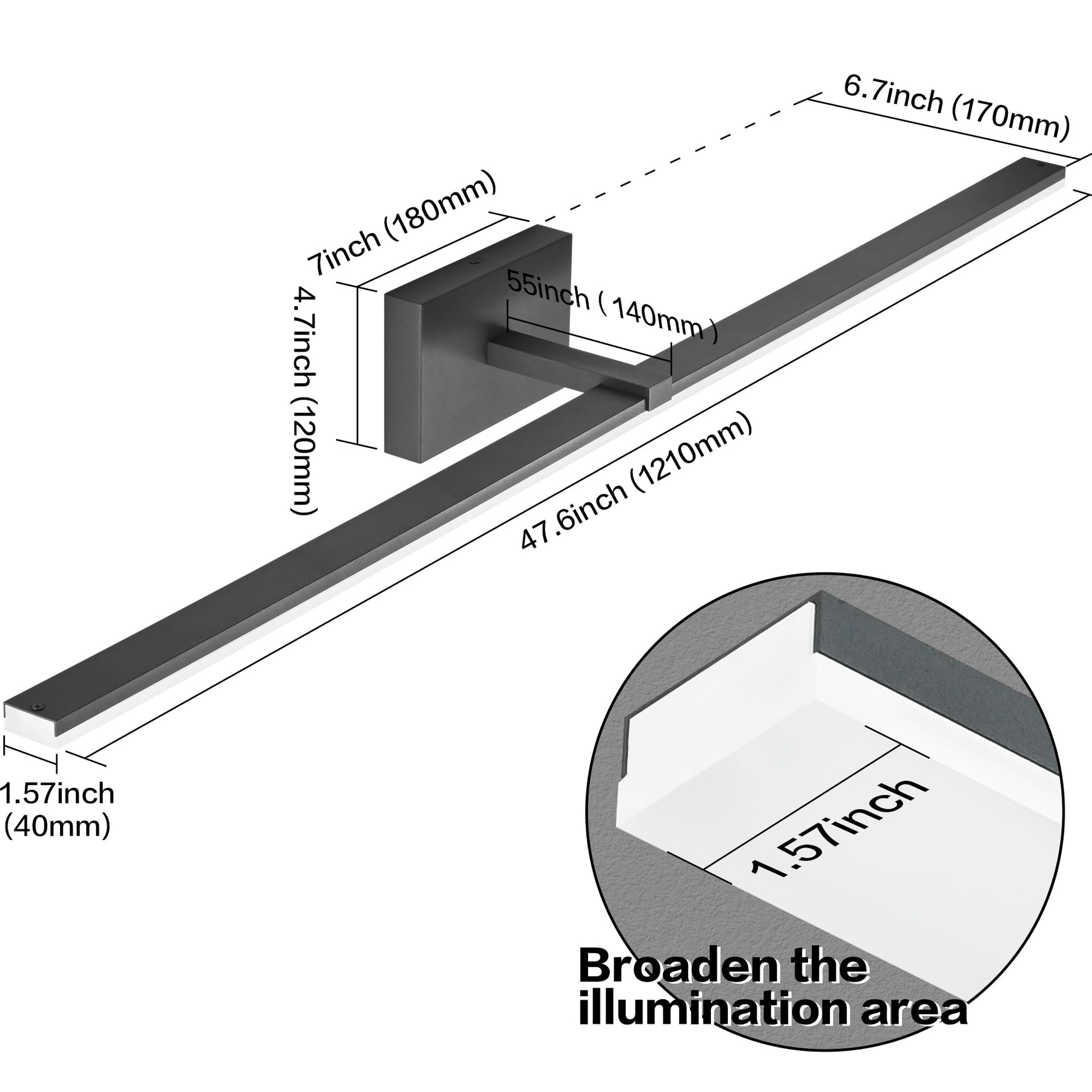 - 【Specification】 The dimension of black bathroom light fixture is 40” * 6.7” * 4.7”(L*W*H). Its minimalist and sleek design makes it ideal for a large bathroom mirror or medicine cabinet or sink or powder room.